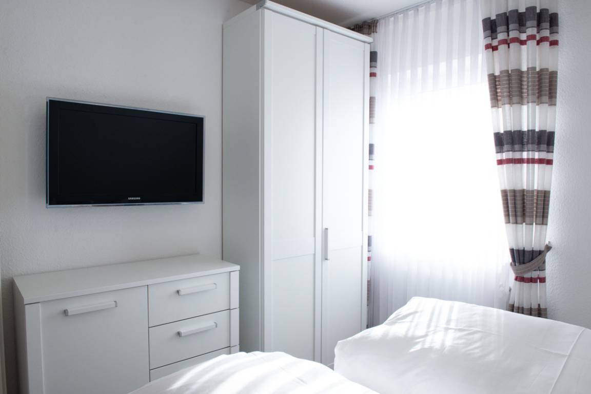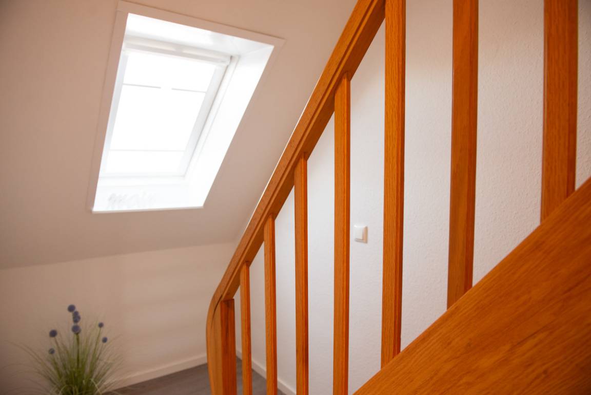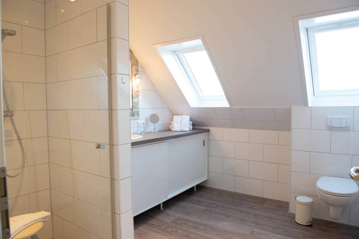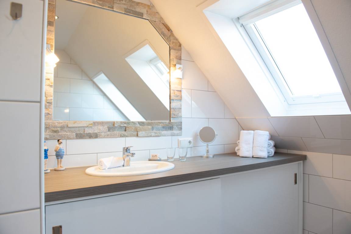 Die Ferienwohnung Clipper liegt im 2. OG und verfügt über zwei getrennte Schlafzimmer, davon ist das untere Schlafzimmer mit Außenrollläden und Sat/TV ausgestattet. Das 2. Schlafzimmer geht über eine Treppe innerhalb der Wohnung eine Etage höher und hat Verdunkelungs - Plissees. Das moderne Bad/WC ist mit einem Veluxfenster, einer bodenebenen Dusche und einem Handtuchhalter - Heizungskörper ausgestattet.