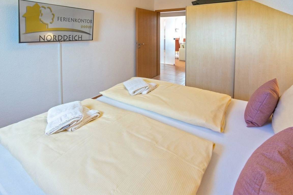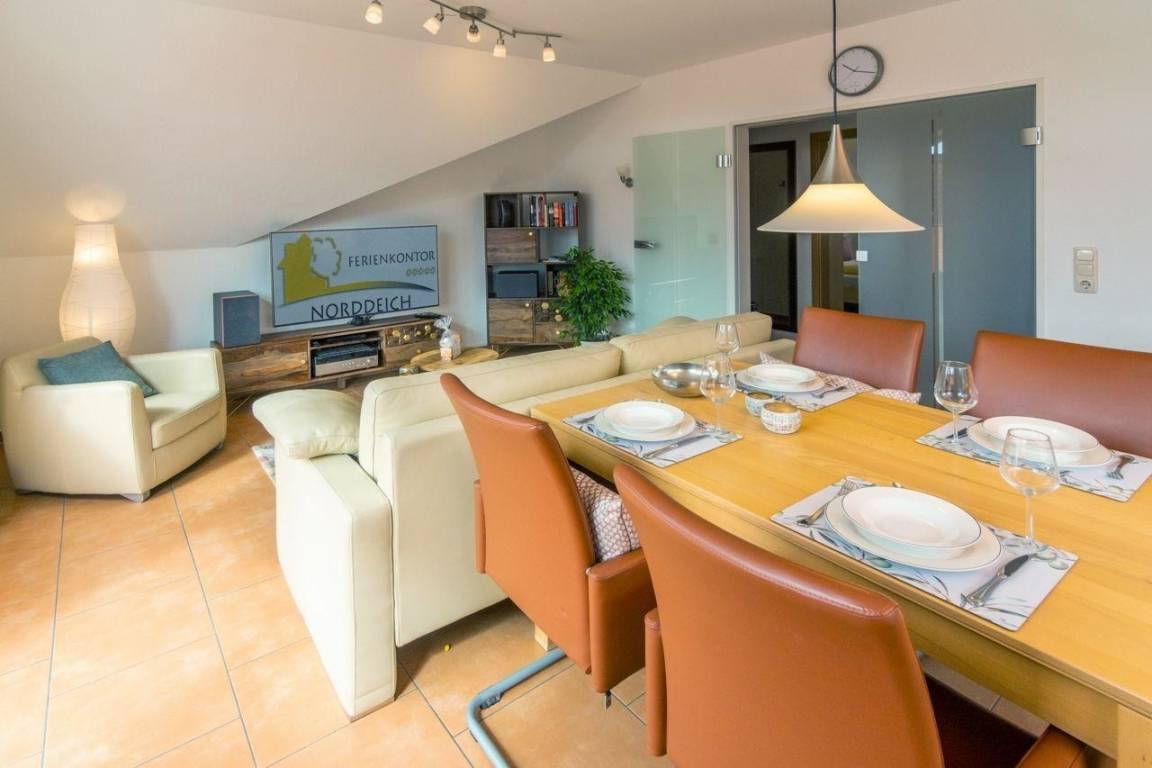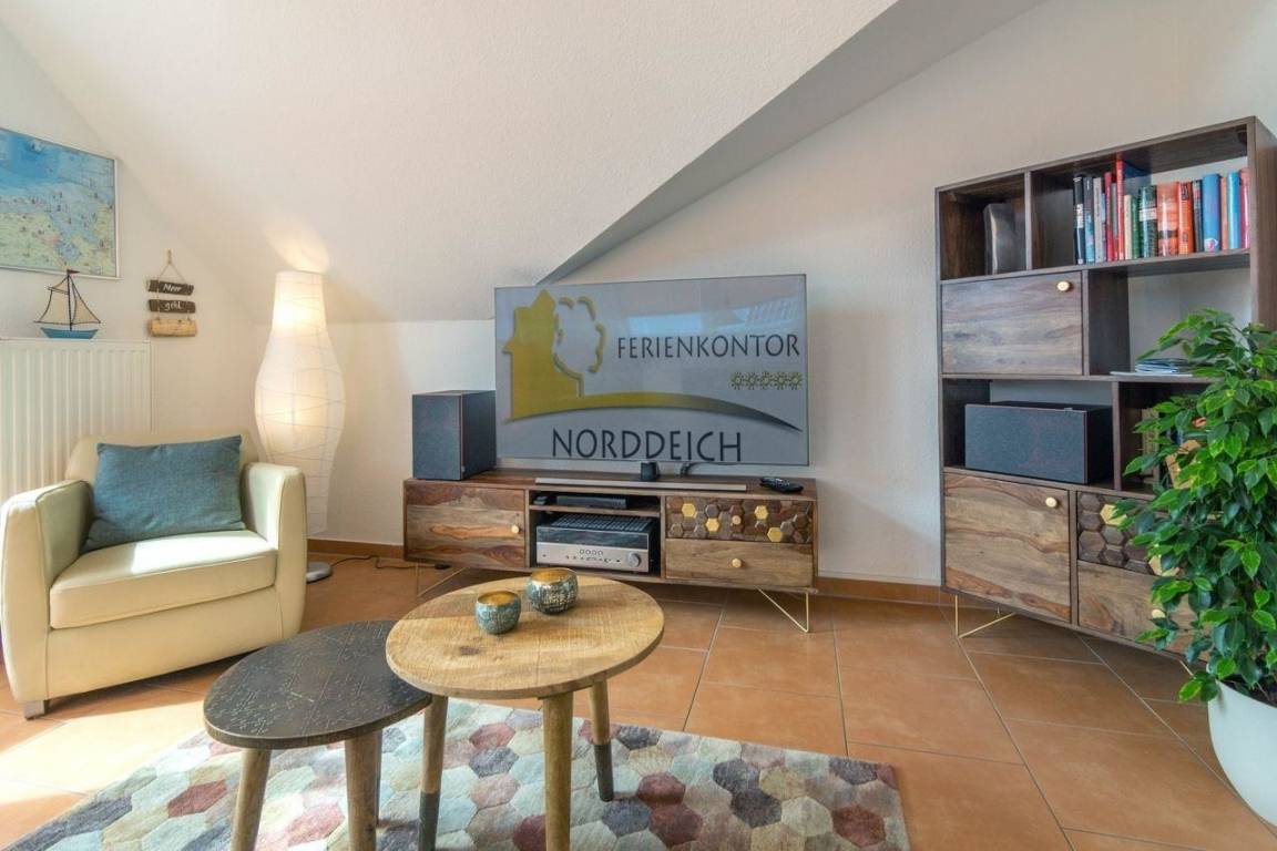 Das Appartementhaus, welches dieses Feriendomizil beherbergt, liegt in einer Nebenstraße in zentraler Lage im schönen Norddeich. Das ehemalige Fischerdorf präsentiert sich heute als abwechslungsreicher Badeort, der für seine hervorragende Luftqualität bekannt ist. Sie erreichen die Nordsee, den Sandstrand und den Hafen in wenigen Minuten ganz bequem zu Fuß.