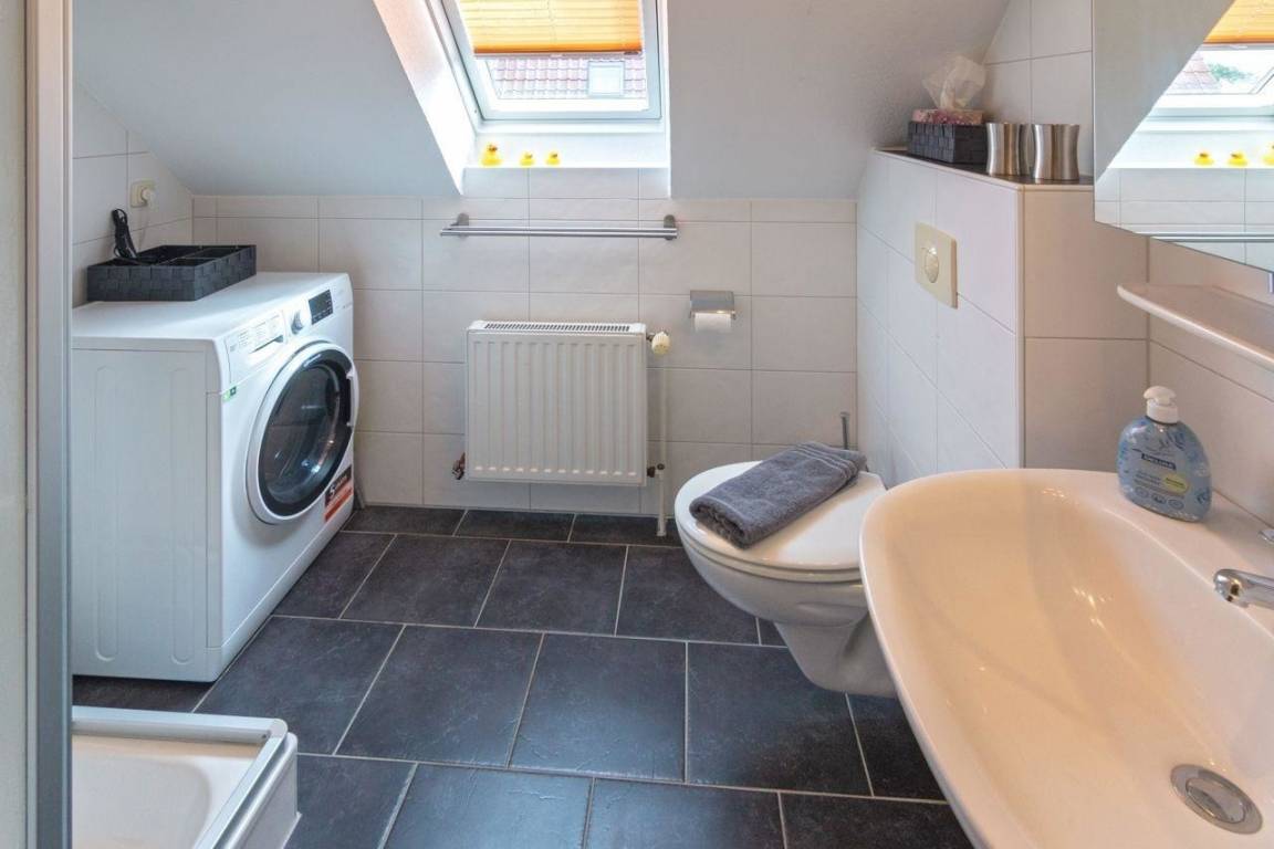 Das Badezimmer der Wohnung wurde mit einer Dusche, einem WC sowie einer Waschkombination mit Spiegel ausgestattet. Hier finden Sie zudem einen Waschtrockner.