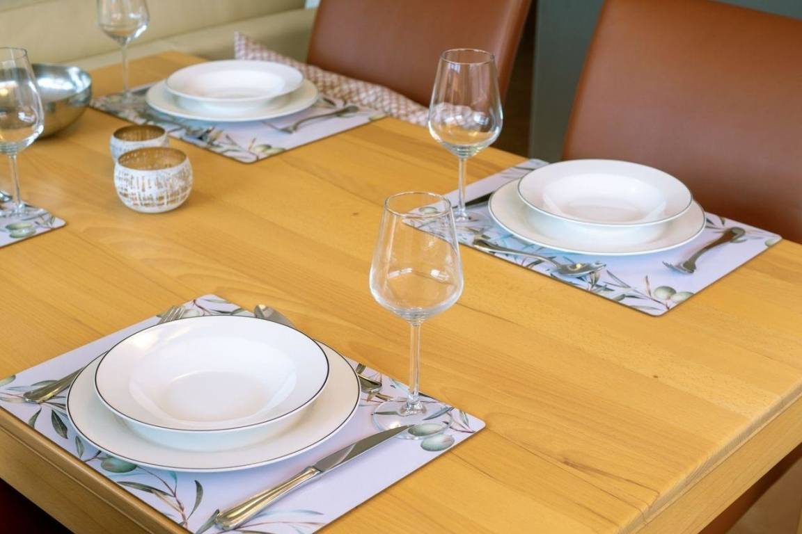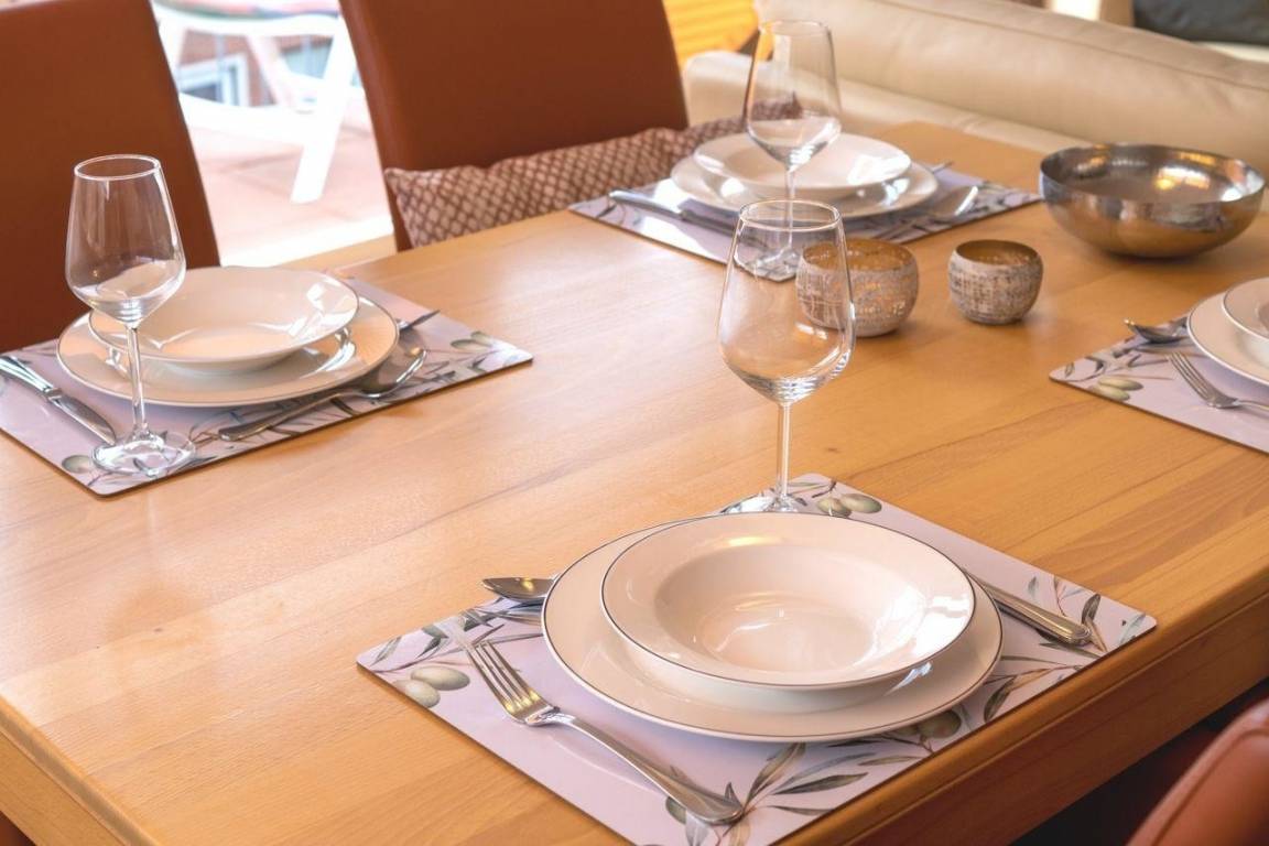 Die Küche wurde kompakt und doch funktional und durchdacht gestaltet. Ein Herd mit Backofen gehört ebenso zu den Annehmlichkeiten der Unterkunft wie Kaffeemaschine, Kühlschrank, Mikrowelle, Geschirrspüler in der Küchenzeile, Toaster und Eierkocher. Besteck, Geschirr und Glaswaren stehen selbstverständlich ebenfalls zur Verfügung.