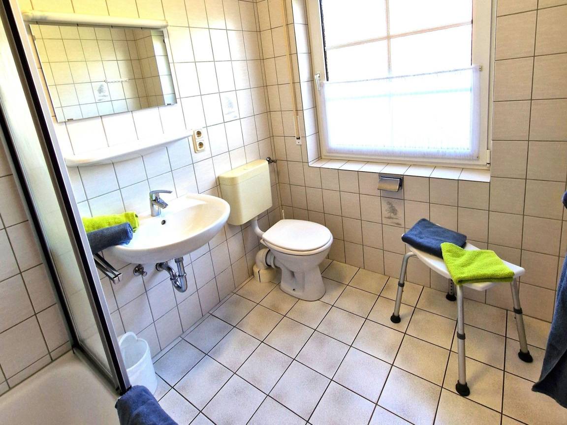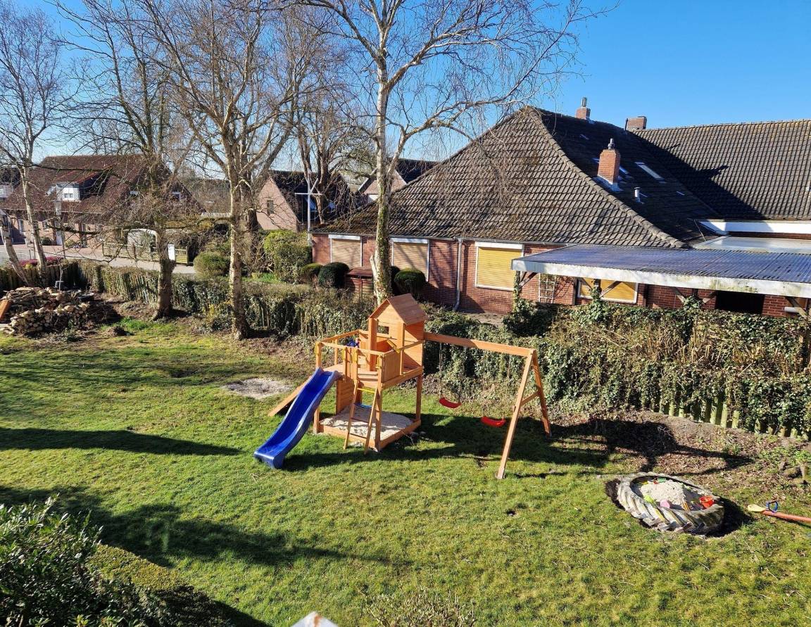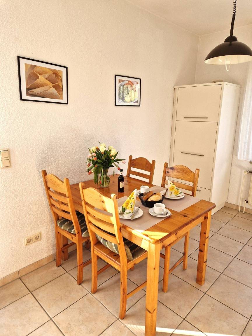 Die Ferienwohnung im Erdgeschoss verfügt über eine Fläche von ca. 60 m² und ist für bis zu 4 Personen sowie ein Baby geeignet. Der offene Wohnbereich ist mit einer modernen Küche ausgestattet, die ein Ceranfeld, einen Backofen, einen Kühlschrank mit Gefrierfach sowie einen Toaster, Wasserkocher und eine Kaffeemaschine umfasst. Die Wohnung bietet zudem zwei Schlafzimmer: eines mit einem Doppelbett und das andere mit zwei Einzelbetten. Das Badezimmer ist mit einer Dusche und einem Fenster ausgestattet. WLAN und ein kostenloser Stellplatz am Haus stehen zur Verfügung. Bettwäsche und Handtücher sind nicht im Angebot enthalten, können jedoch gegen Gebühr hinzugebucht werden. Im gemeinschaftlichen Garten befindet sich ein privater Spielplatz. Haustiere sind in dieser Unterkunft nicht gestattet. Die Schlüsselabholung erfolgt in der Norddeicher Str. 55 in Norden.