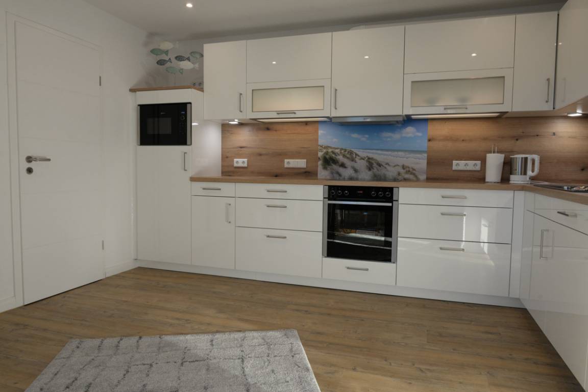 Die Einbauküche verfügt über Backofen, Geschirrspüler, Kühlschrank, Cerankochfeld und Mikrowelle.