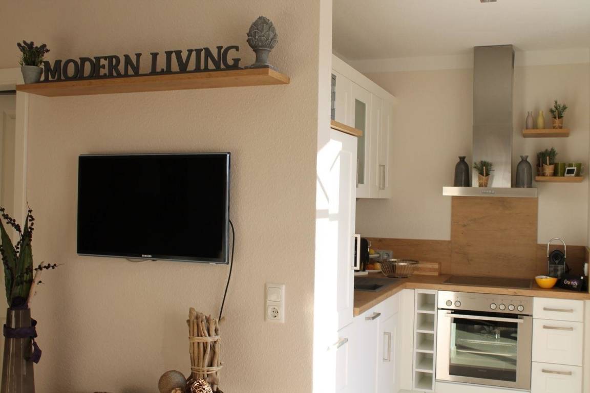 Die Naturtöne weiß, sand und braun dominieren in der modern country Einrichtung und Ausstattung der Ferienwohnung. Alte Stilelemente kombiniert mit moderner Einrichtung verleihen der Ferienwohnung ein exclusives Flair.