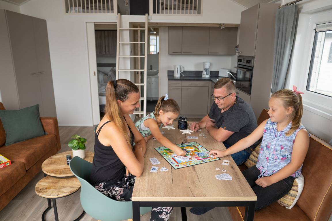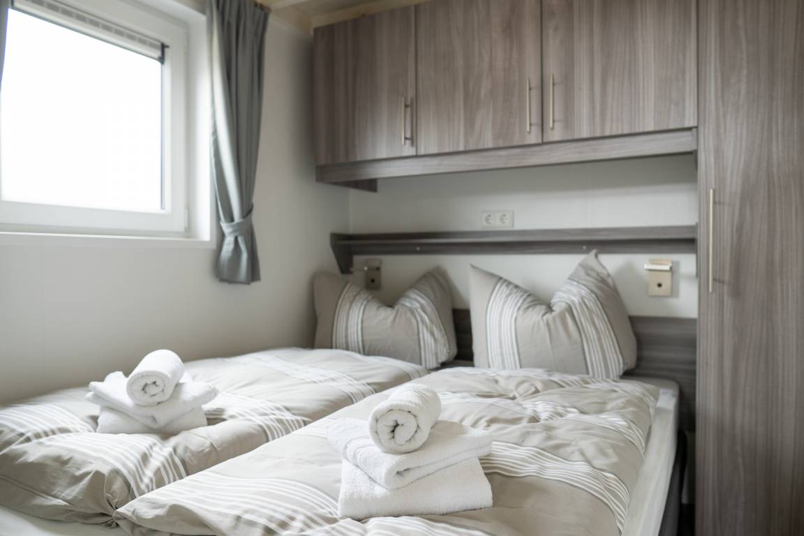 Ferienhaus mit rd. 29m² und Platz für bis zu vier Personen. Ein Schlafzimmer mit Boxspringbetten, zwei weitere Schlafmöglichkeiten finden Sie im Wohn- und Schlafbereich. Großer Wohnraum mit Küche, Sitzgelegenheiten und Unterhaltungsmedien (TV), dazu ein Badezimmer. Im Außenbereich gibt es einen Parkplatz für Ihr Auto und die Terrasse lädt zum gemütlichen Verweilen ein. Die Chalets befinden sich in einem eigenen Parkareal unseres Platzes mit eigener Zufahrt über den Campingplatz.