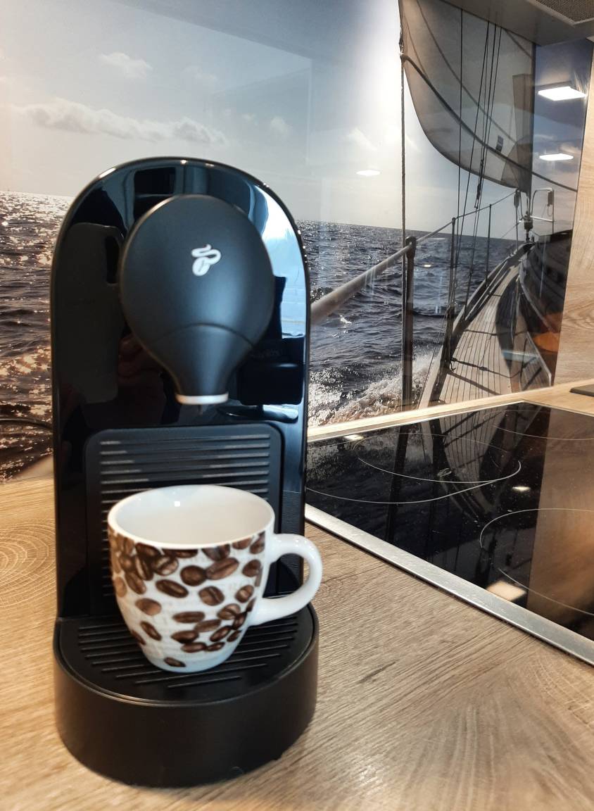 Der angrenzende Esstisch lädt zu gemeinsamen Mahlzeiten, Spieleabenden oder entspannten Gesprächen ein. Die moderne Küche ist komplett ausgestattet – mit hochwertigen Geräten wie Backofen, Cerankochfeld, Geschirrspüler, Kühlschrank mit Gefrierfach, Kaffeemaschine, Espressomaschine (Kapsel), Airfryer und allem, was Sie zum Kochen benötigen.