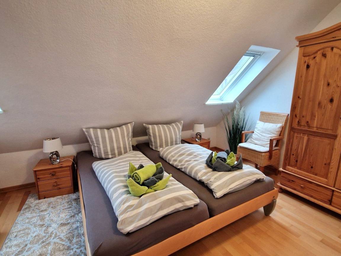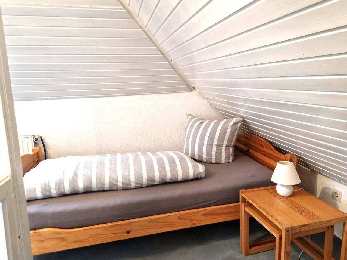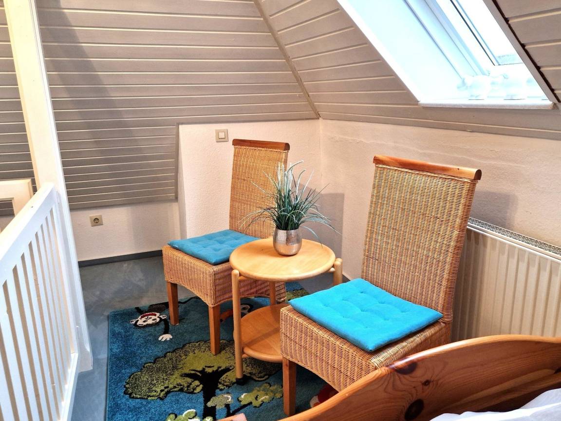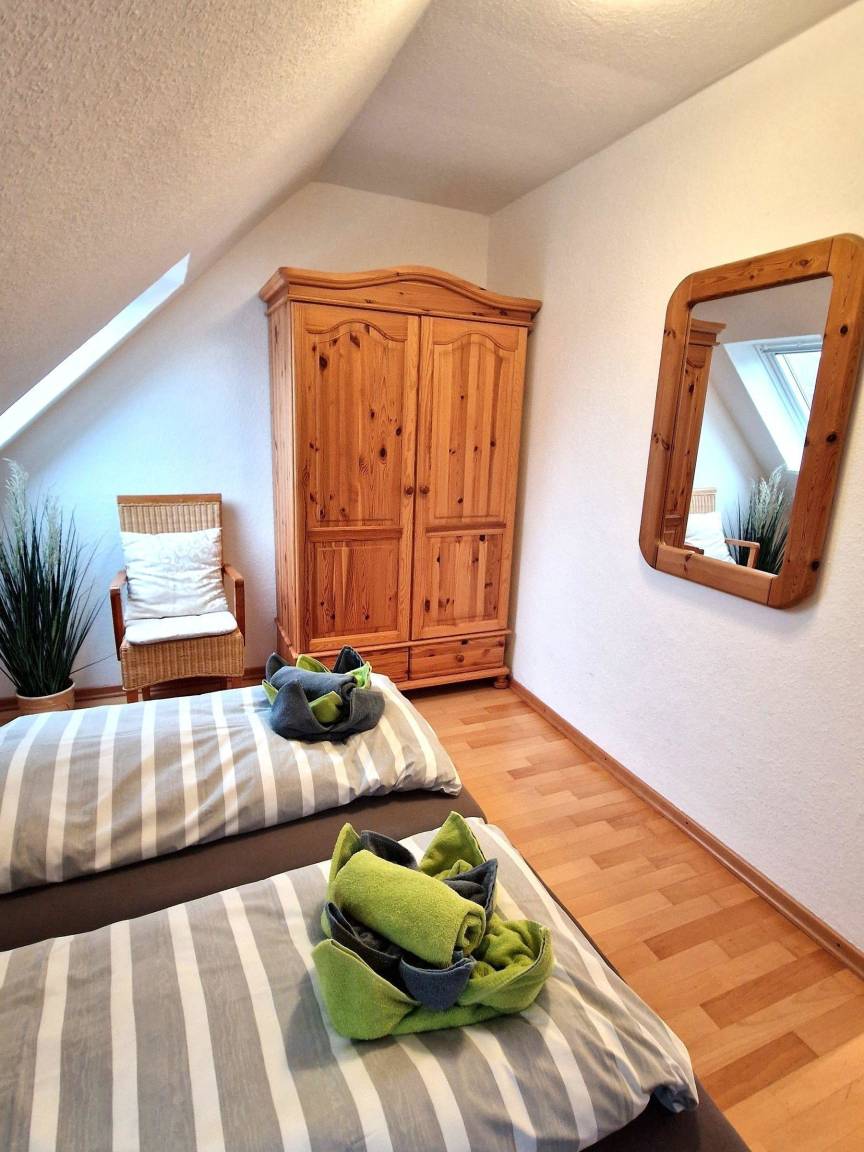 Zwei freundliche Schlafzimmer stehen zur Verfügung: eines mit einem Doppelbett und das zweite im ausgebauten Dachgeschoss mit zwei Einzelbetten, erreichbar über eine Raumspartreppe. Die Wohnung ist mit Außenjalousien und Verdunklungsrollos ausgestattet.