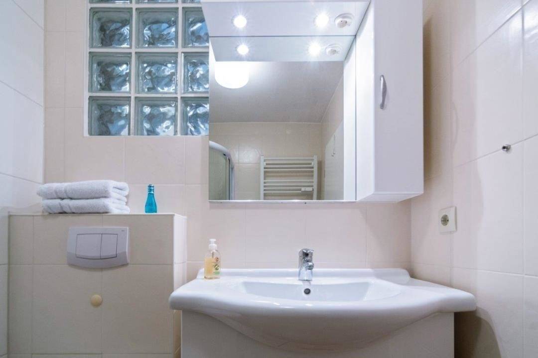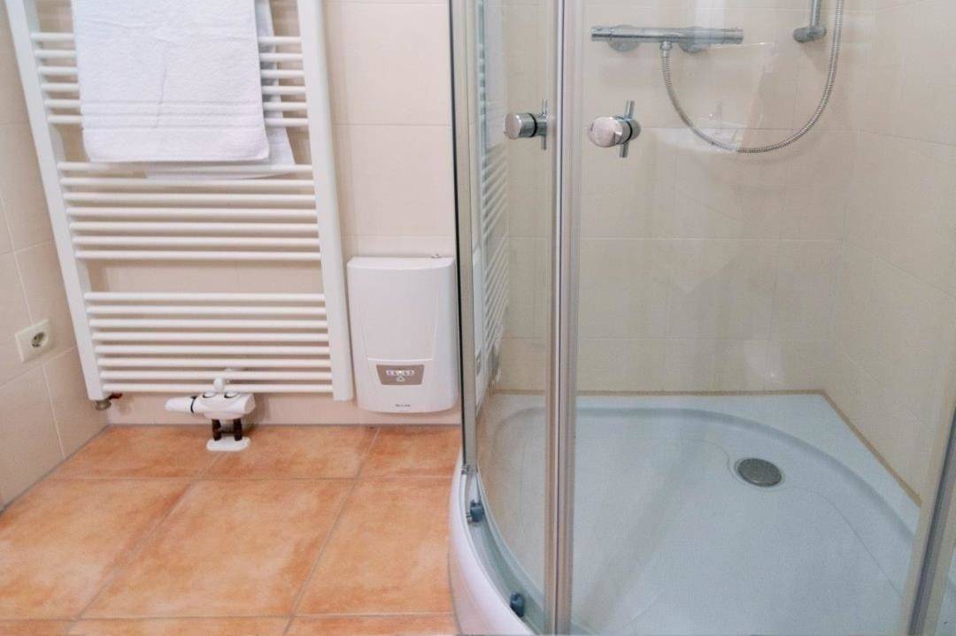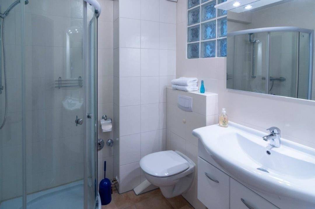 Das Badezimmer verfügt über eine Dusche, WC und eine Waschkombination mit Spiegel.