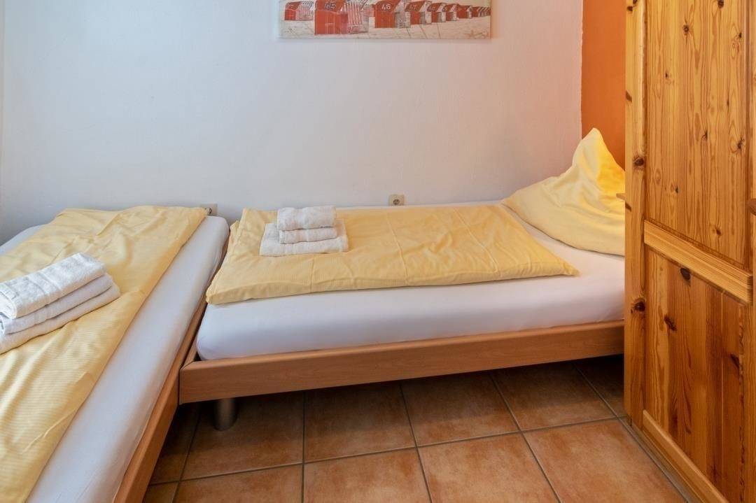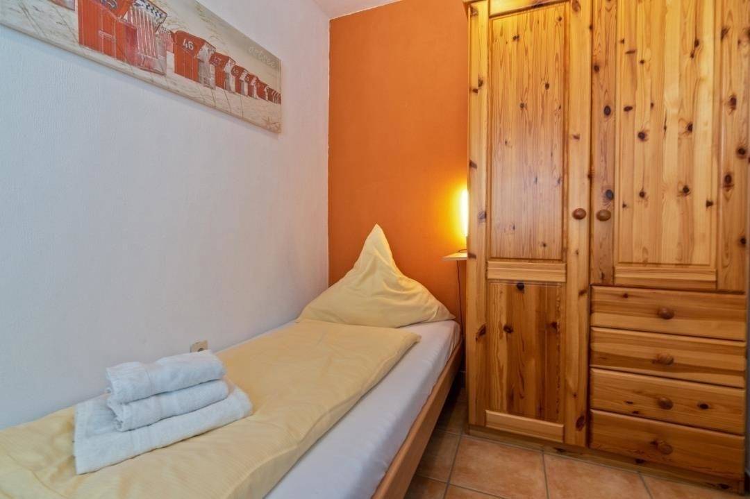Das kleine Schlafzimmer hat zwei 90 x 200 cm Einzelbetten. Ein kleiner Schrank bietet Platz für ihre Garderobe. Ein weiterer Schrank für Jacken und Mäntel befindet sich im Flur.