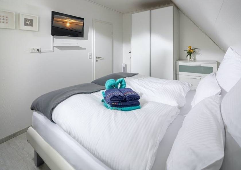 Allergiker gerechte Ausstattung, mit Kopfkissen und Oberbetten aus kochfester Mikrofaser, hochwertige Markenmatratzen mit Encasing. Doppelbett 180 x 220, Komforthöhe, TV. Nicht für Kleinkinder geeignet!