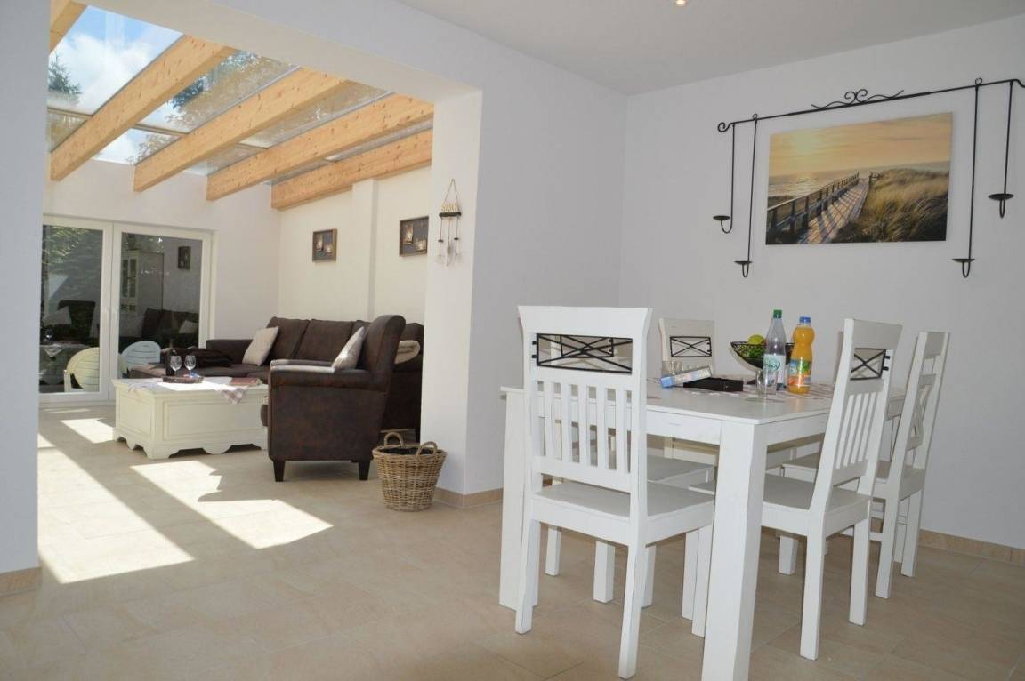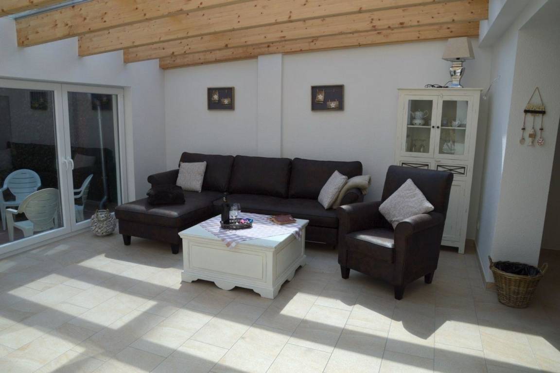 In warmen Naturtönen gehalten lädt der Wohnraum mit angrenzendem großen Wintergarten zum Verweilen ein. Von der bequemen Wohnlandschaft mit Sessel im Wintergarten können Sie in den Garten sehen, den Flammen im Kamin zusehen oder auch fernsehen. Der angrenzende Esstisch mit Stühlen ist nicht nur für gediegende Mahlzeiten bestens geeignet sondern auch für spannende Spieleabende.