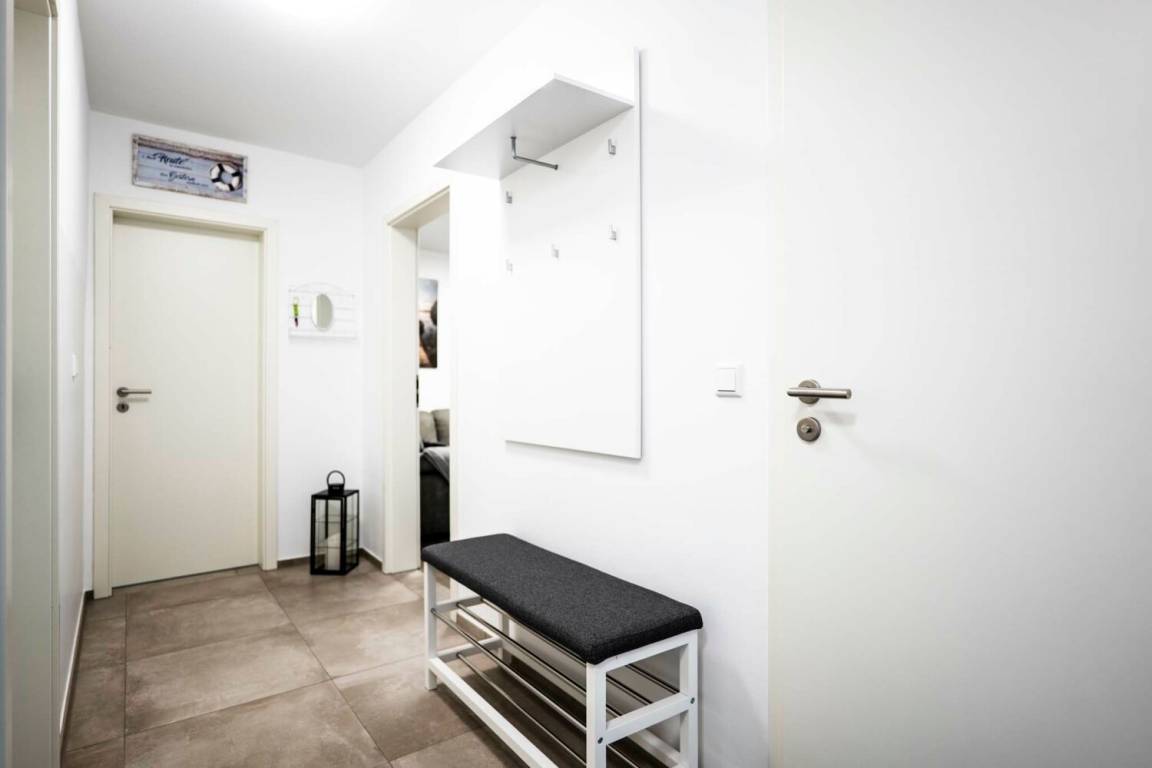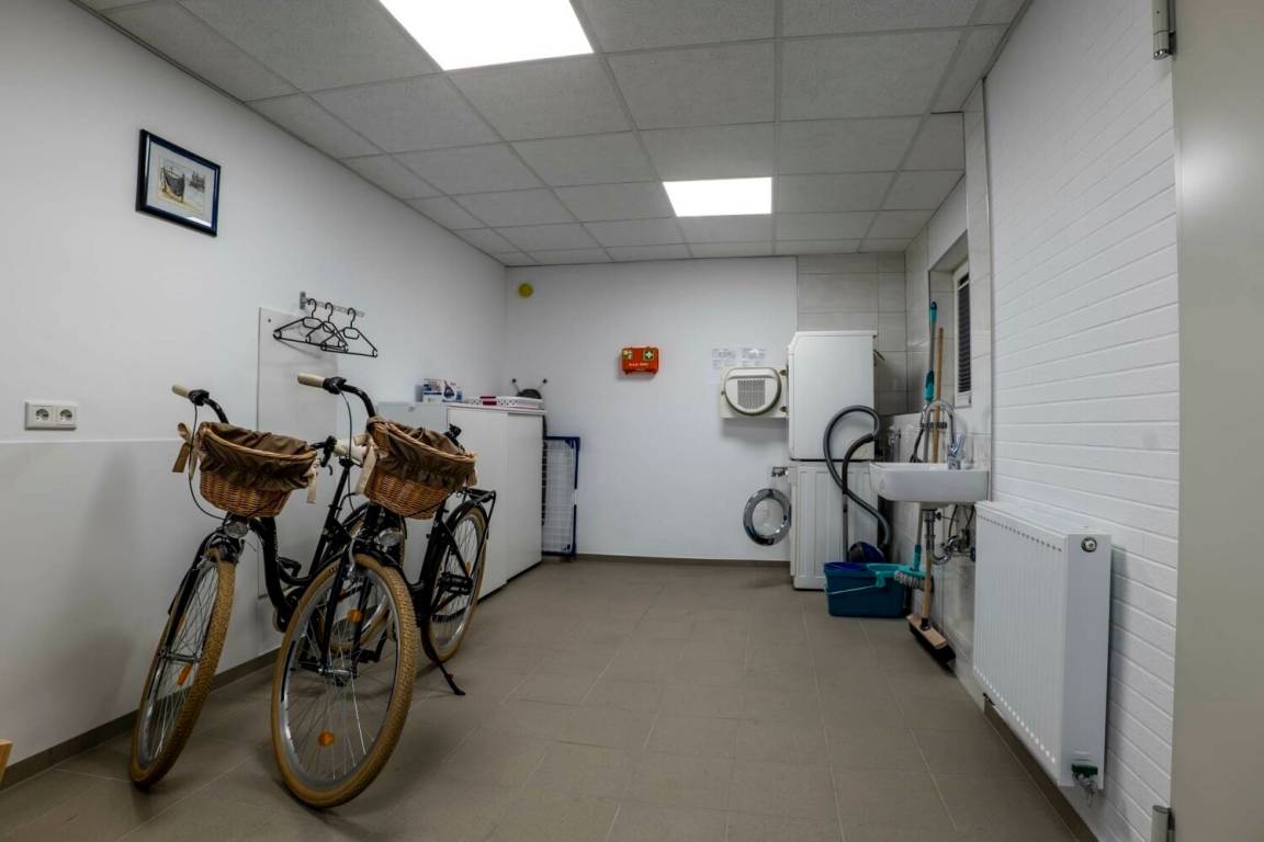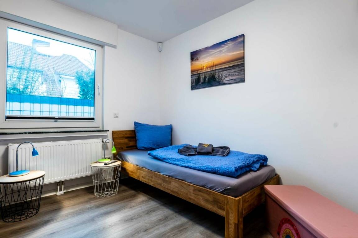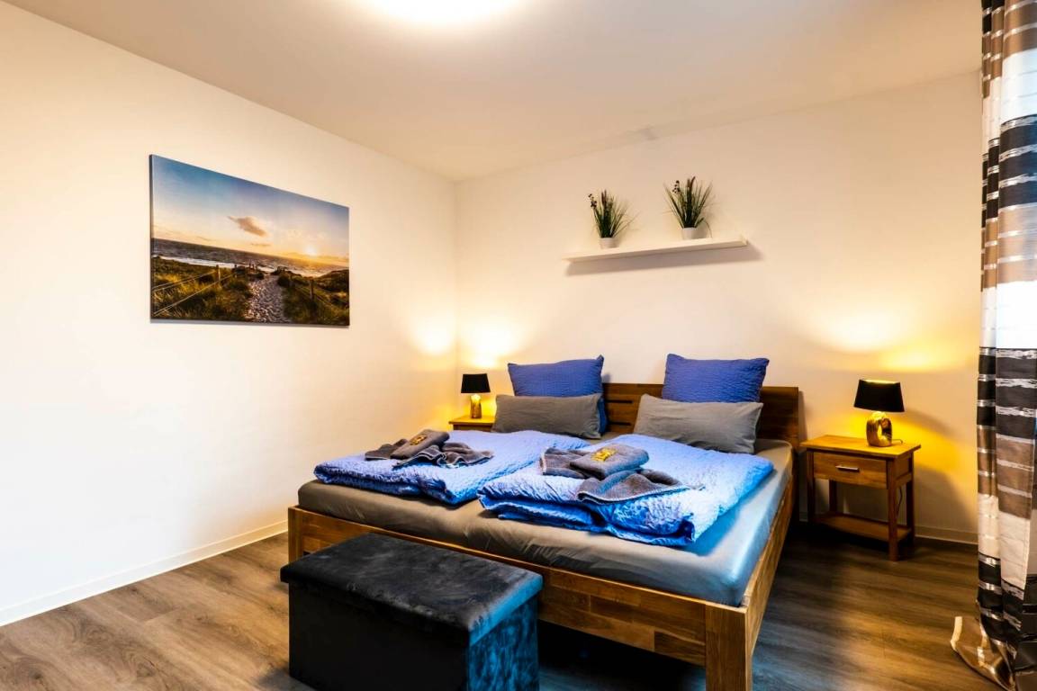 Ein Schlafzimmer bietet ein Doppelbett, Kleiderschrank und TV-Gerät, das zweite Schlafzimmer ist mit zwei Einzelbetten sowie TV ausgestattet. Für die kleinsten Gäste steht eine kleine Spielesammlung zur Verfügung. Im separaten Waschraum befinden sich Waschmaschine, Trockner, Bügelbrett und Bügeleisen. Zwei PKW-Stellplätze stehen direkt am Ferienhaus zur Verfügung. Bettwäsche und Handtücher sind inklusive.