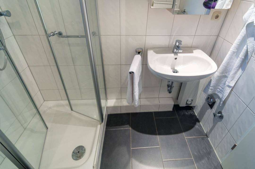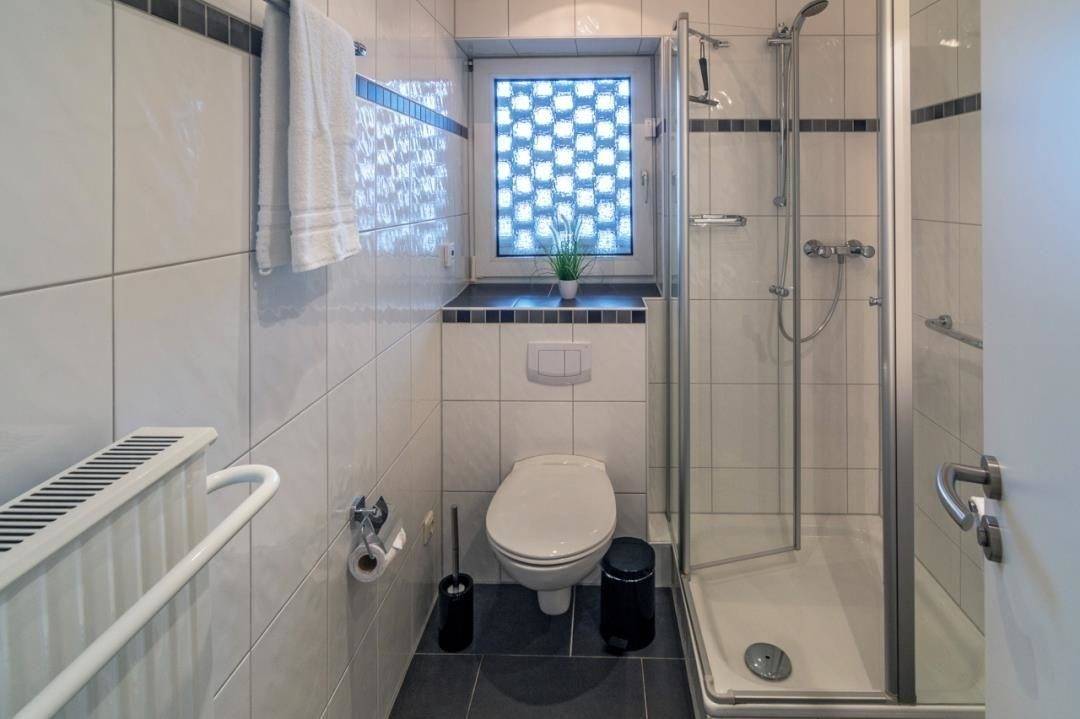 Besonders schön ist auch das Tageslichtbad, das mit hochwertigen eleganten Fliesen, einem Waschbecken, WC, einer Dusche mit niedrigem Einstieg, einem Spiegelschrank, Haartrockner und einem Handtuchheizkörper optimal ausgestattet ist.