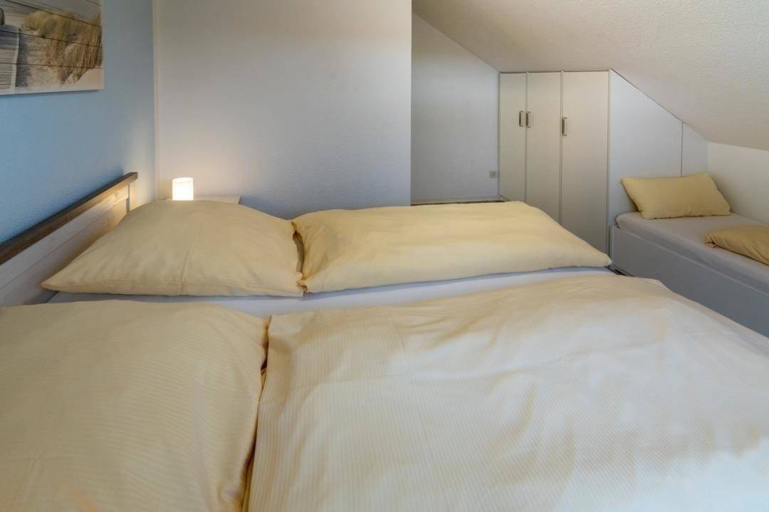Das Schlafzimmer ermöglicht wie der Wohnraum den direkten Zugang zum Balkon und bietet Platz für drei Personen. Hier gehören ein 180 x 200 cm großes Doppelbett mit getrennten Matratzen und im Fuß- und Kopfbereich verstellbaren Lattenrosten, ein 90 x 200 cm großes Einzelbett, zwei Nachttische mit Leselampen sowie ein dreitüriger Kleiderschrank zur Ausstattung. Die Fenster lassen sich durch Rollläden verdunkeln.