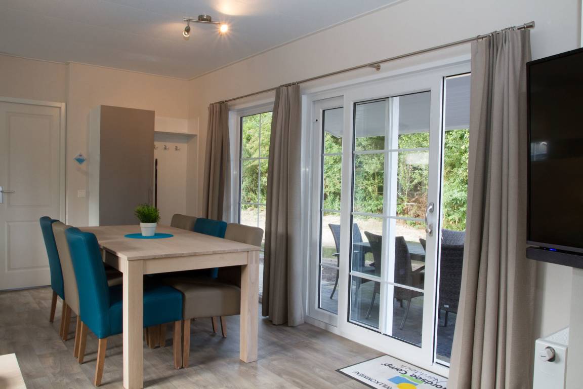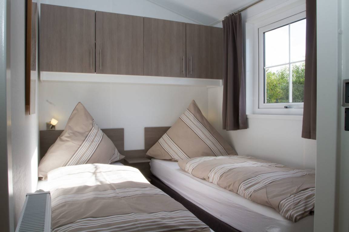 Ferienhaus mit rd. 50m² und Platz für bis zu sechs Personen. 3 Schlafzimmer (davon 2 mit TV und 1 mal Etagenbett), 2 Badezimmer. großer Wohnraum mit Küche, Sitzgelegenheiten und Unterhaltungsmedien (TV). Im Außenbereich gibt es einen Stellplatz für Ihr Auto und die Terrasse lädt zum gemütlichen Verweilen ein. Die Chalets befinden sich in einem eigenen Parkareal unseres Platzes mit eigener Zufahrt.