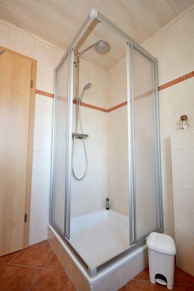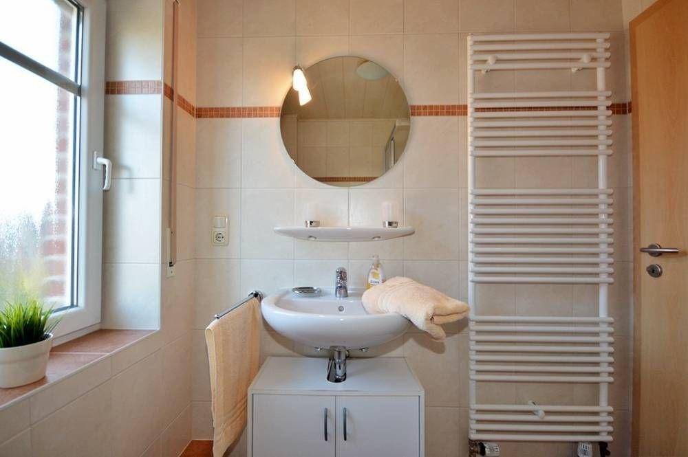Die 0,90x0,90 m große Dusche mit Raindance-Brause im Tageslichtbad macht das Duschen zu wahren Vergnügen. Des weiteren gehört ein Handtuch-Heizkörper, ein Waschbecken mit Spiegel und Unterschrank zur Badezimmerausstattung.