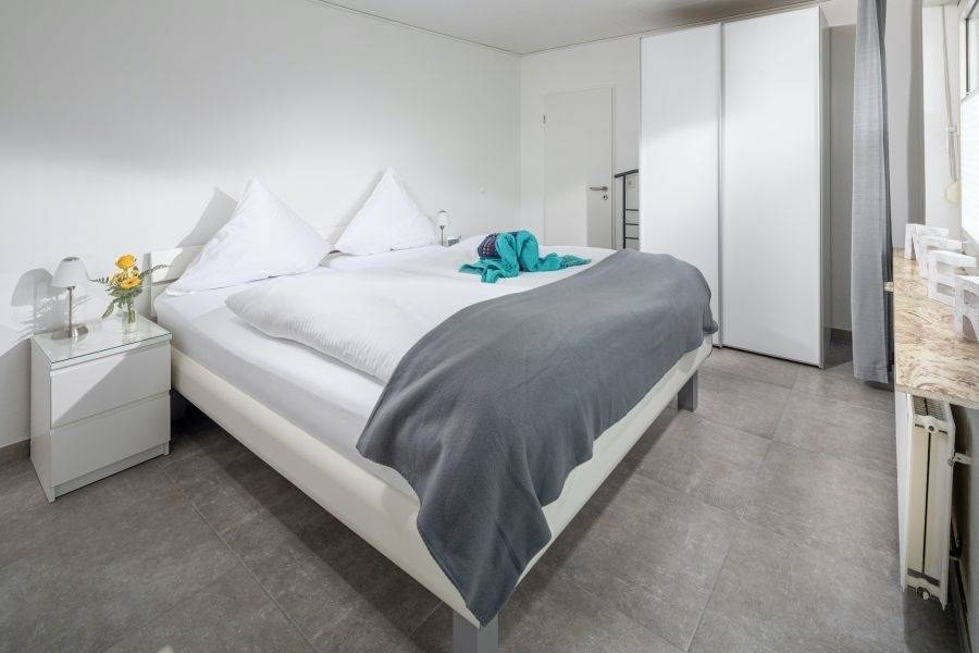Allergiker gerechte Ausstattung, mit Kopfkissen und Oberbetten aus kochfester Mikrofaser, hochwertigen Markenmatratzen mit Encasing. Doppelbett in Übergröße und Komforthöhe für einen bequemen Ein- und Ausstieg.
