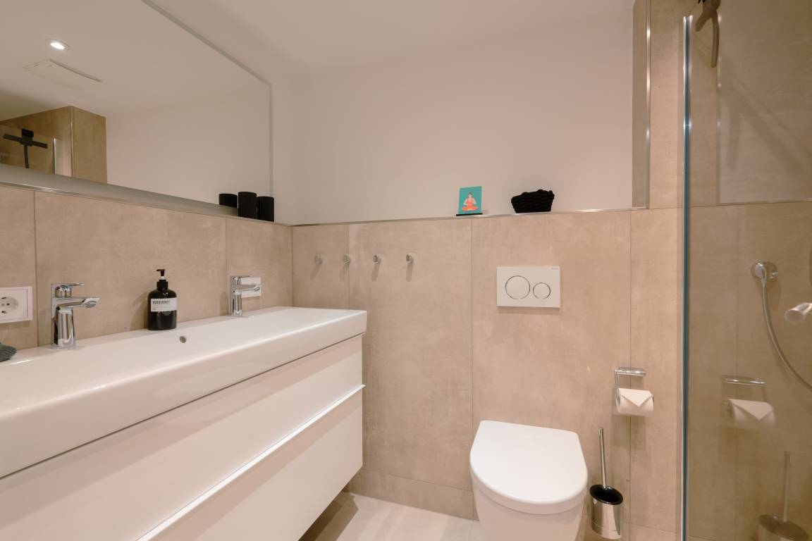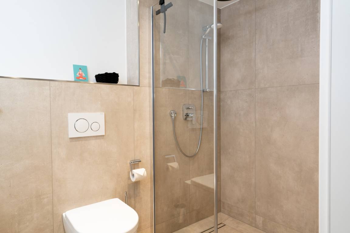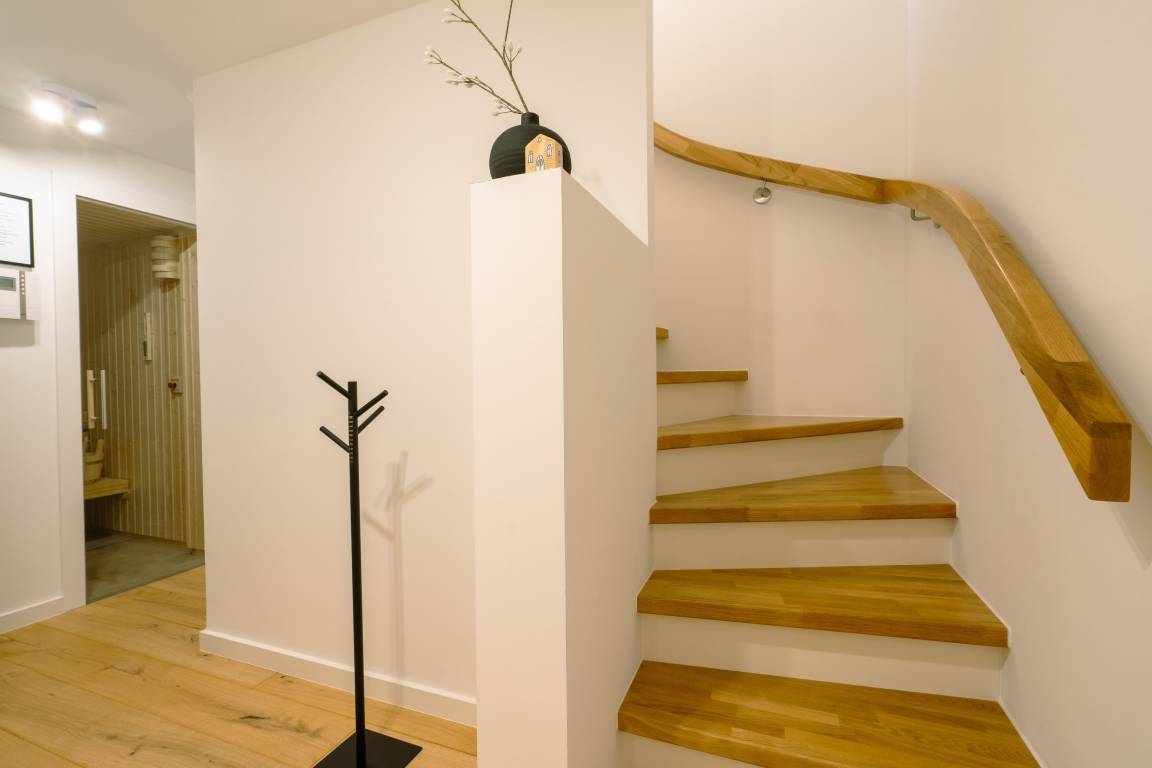 Im Untergeschoss der Ferienwohnung finden Sie zwei Schlafzimmer mit Doppelbetten (1,60m x 2,00m), Smart-TV und Fenstern zum großen Lichtschacht Ihrer Terrasse. Das Badezimmer mit Regendusche und die tolle Sauna mit Platz für bis zu 2 Personen finden sich hier ebenfalls.