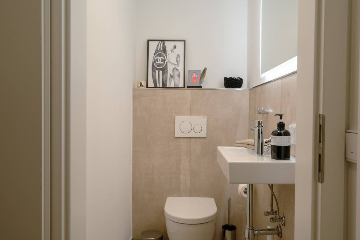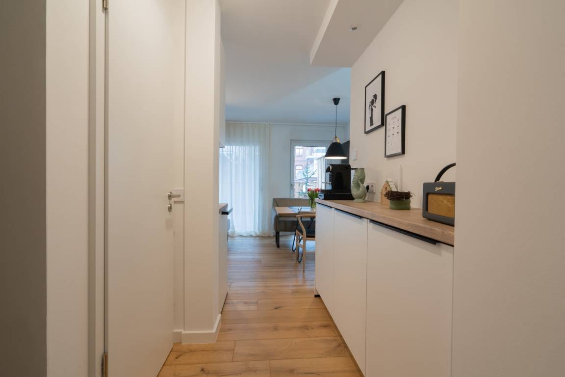 Vom Wohnzimmer im Erdgeschoss mit Essgelegenheit, offener Küche und gemütlichem Sofa haben Sie direkten Zugang zu Ihrer Terrasse mit modernen Gartenmöbeln. Die Wohnung verfügt über eine kleine, aber toll ausgestattete offene Küche mit Induktionskochfeld, Spülmaschine, Backofen-Mikrowellen Kombination und Nespresso-Kaffeemaschine.