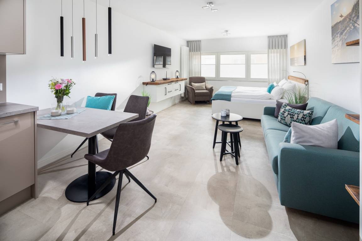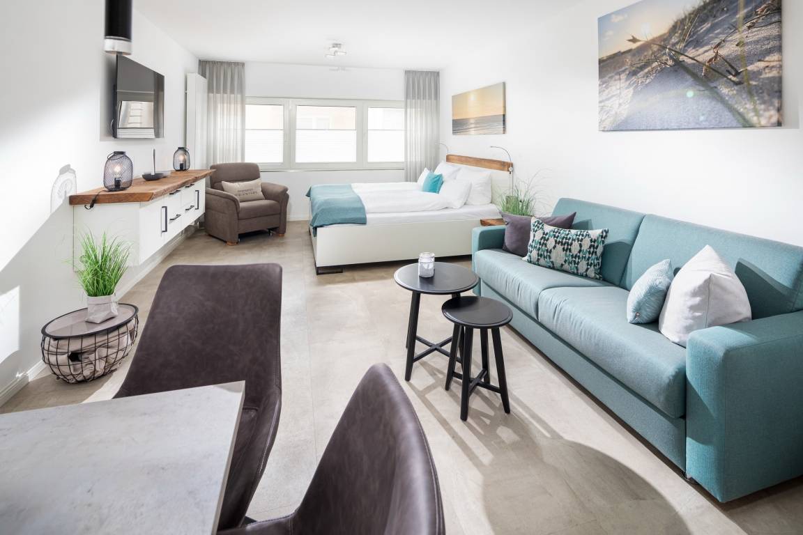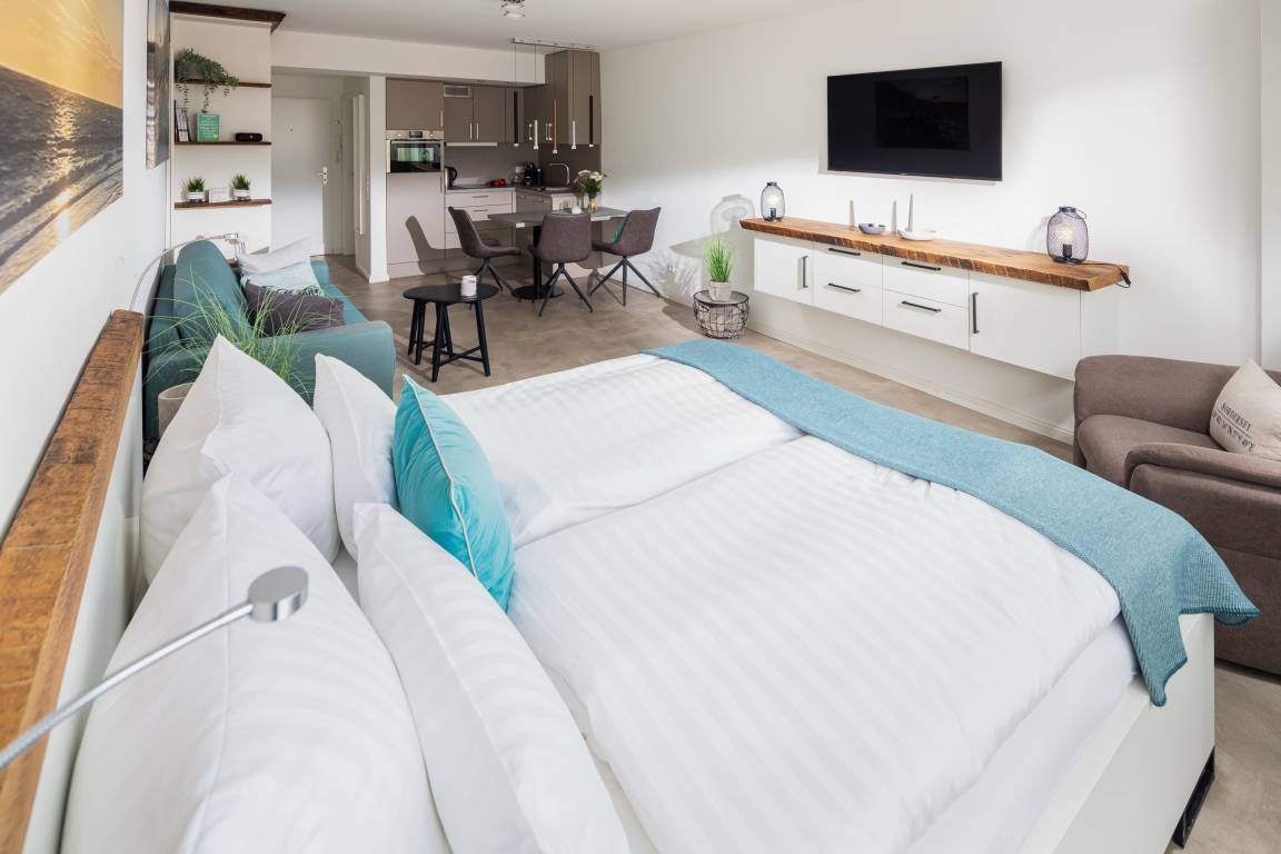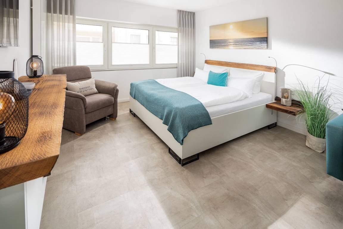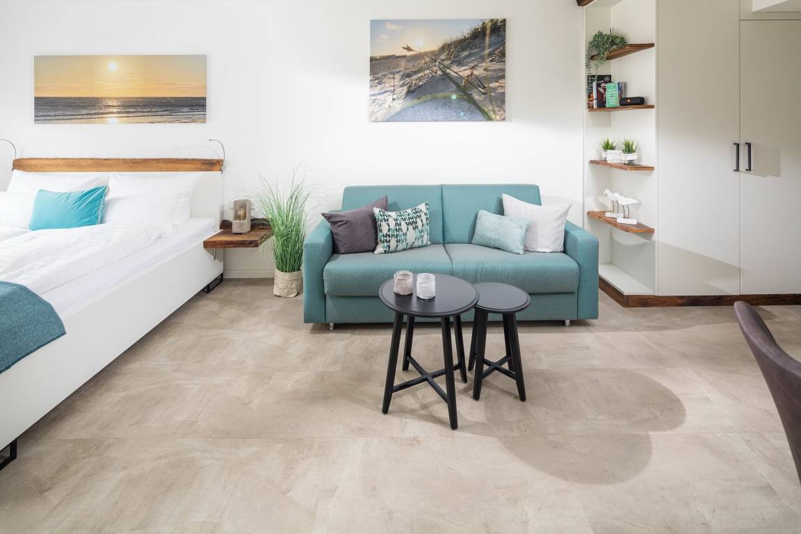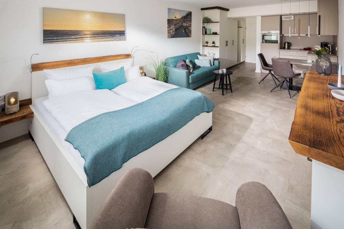 Die „Lüttje Ney" heißt Sie schon beim Eintreten herzlich willkommen. Die 40 qm große Whg wurde 2020 hochwertig und liebevoll saniert. Sie bietet einen modernen und gemütlichen Wohn-und Schlafraum mit einem 1,80m großen Bett und zwei 155 x 220m großen Bettdecken und insgesamt 4 Kopfkissen zum Wohlfühlen. Ein gemütlicher Relaxsessel mit ausziehbarer Fußstütze und ein bequemes Sofa laden zum Lesen oder Fernsehen (Smart-TV) ein.
