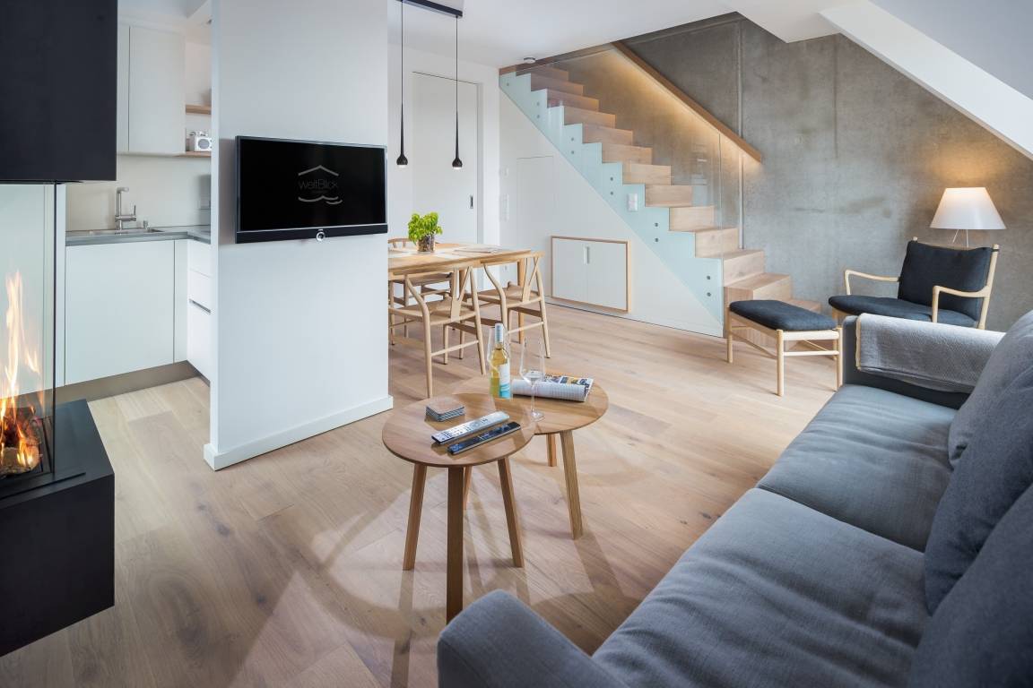 Die Ferienwohnung "meerBlick" ist eine exklusiv ausgestattete Maisonettewohnung mit 80qm für bis zu vier Personen. In der ersten Etage befindet sich ein großzügiger Wohn- und Essbereich mit offener Küche; Kamin und Südbalkon zum Garten, ein Schlafzimmer mit Boxspringbett (2,10m Überlänge), Meerblick sowie ein Bad und ein separates WC. In der oberen Etage ist ein weiteres Schlafzimmer mit Meerblick und Südbalkon zum Garten sowie ein Bad.