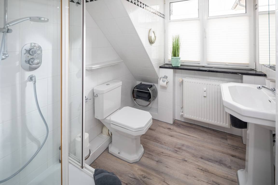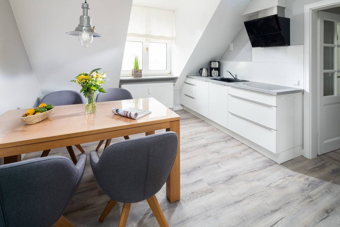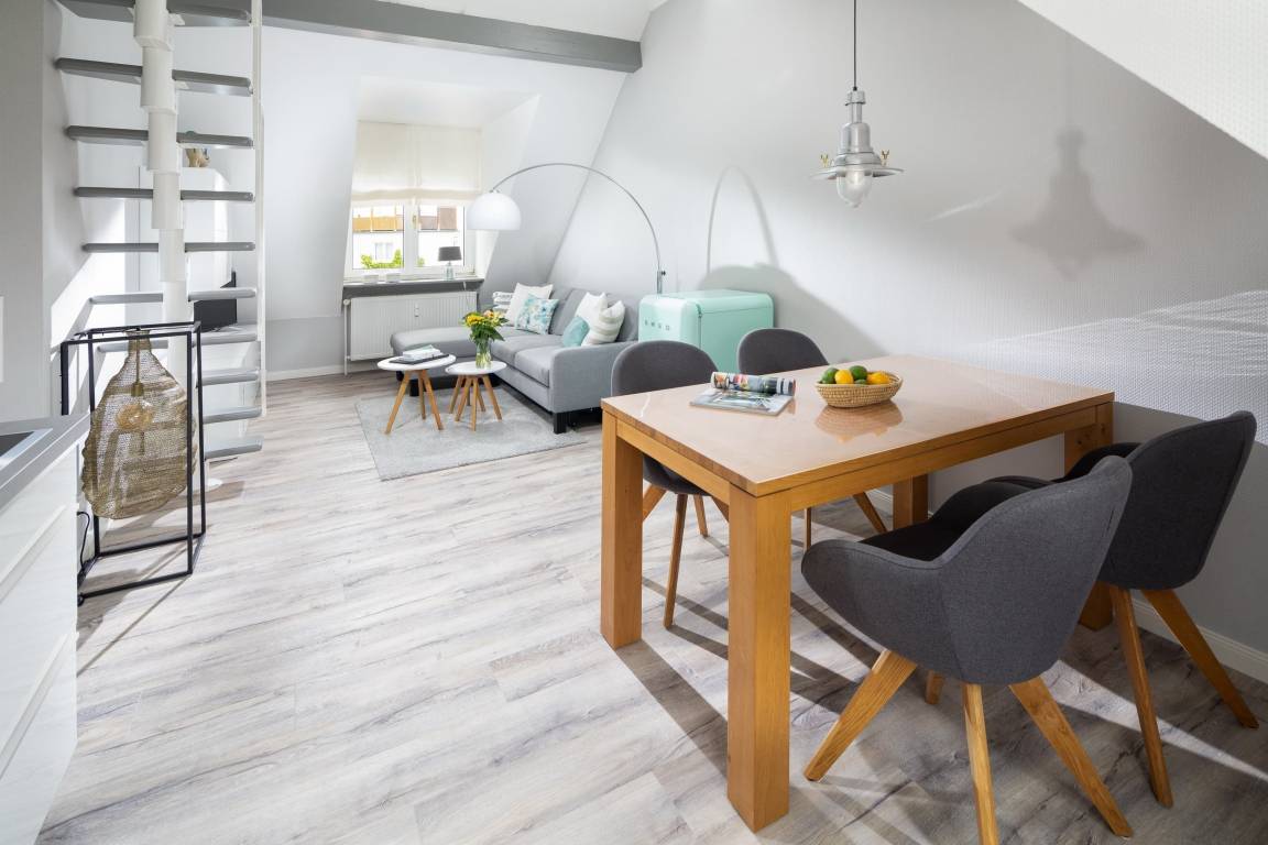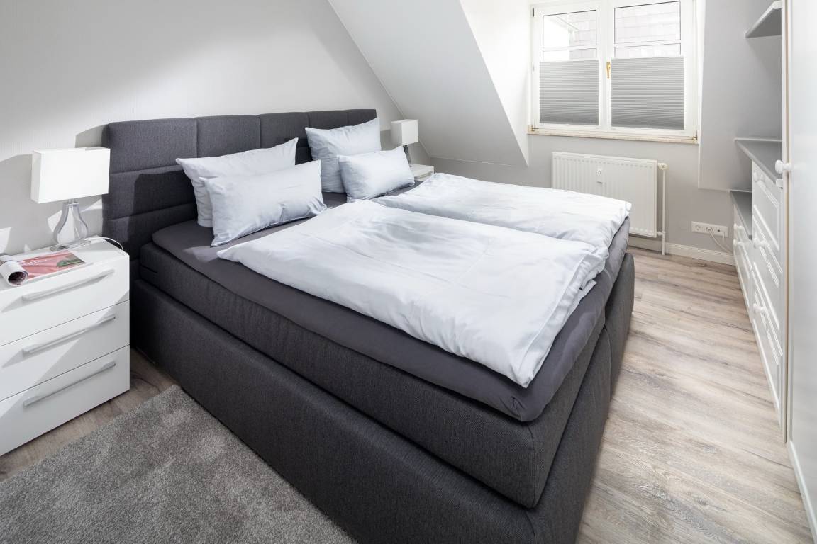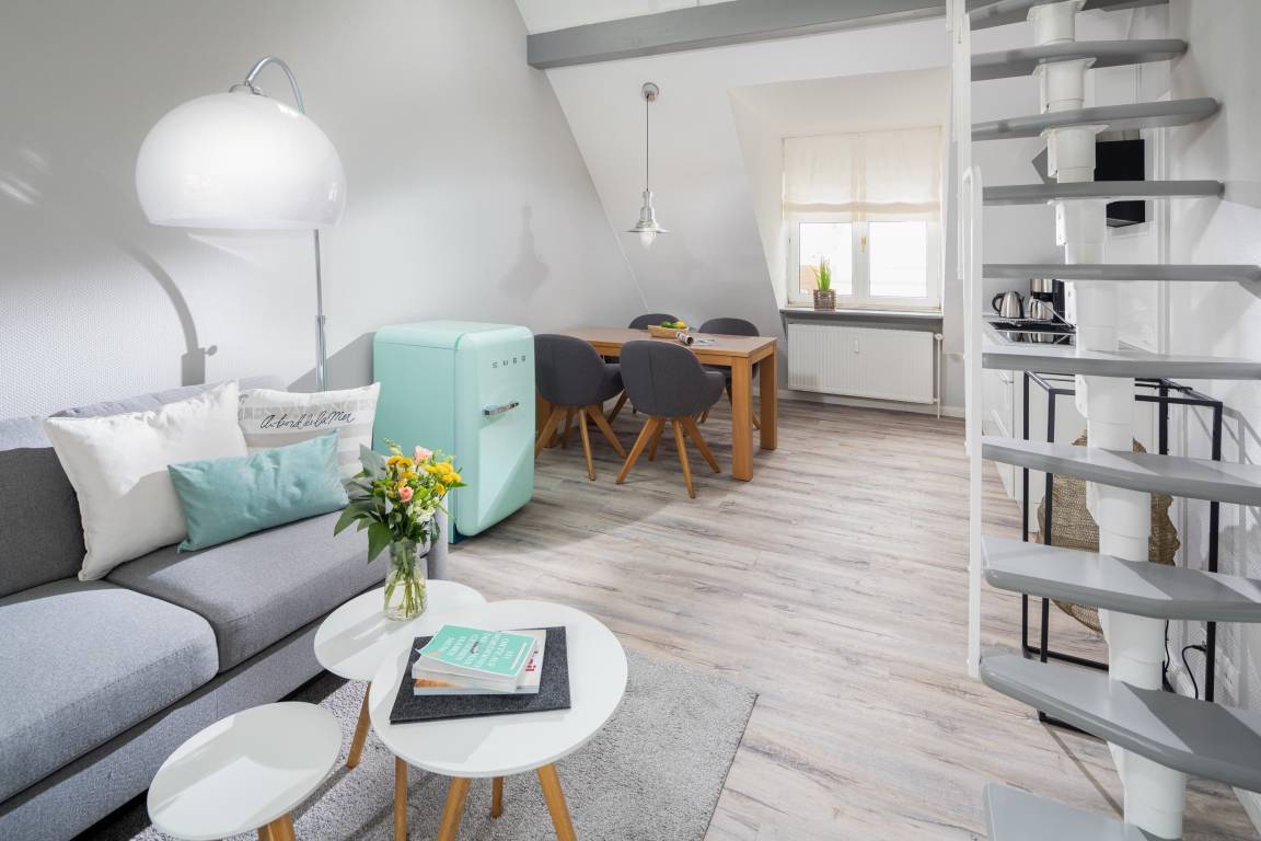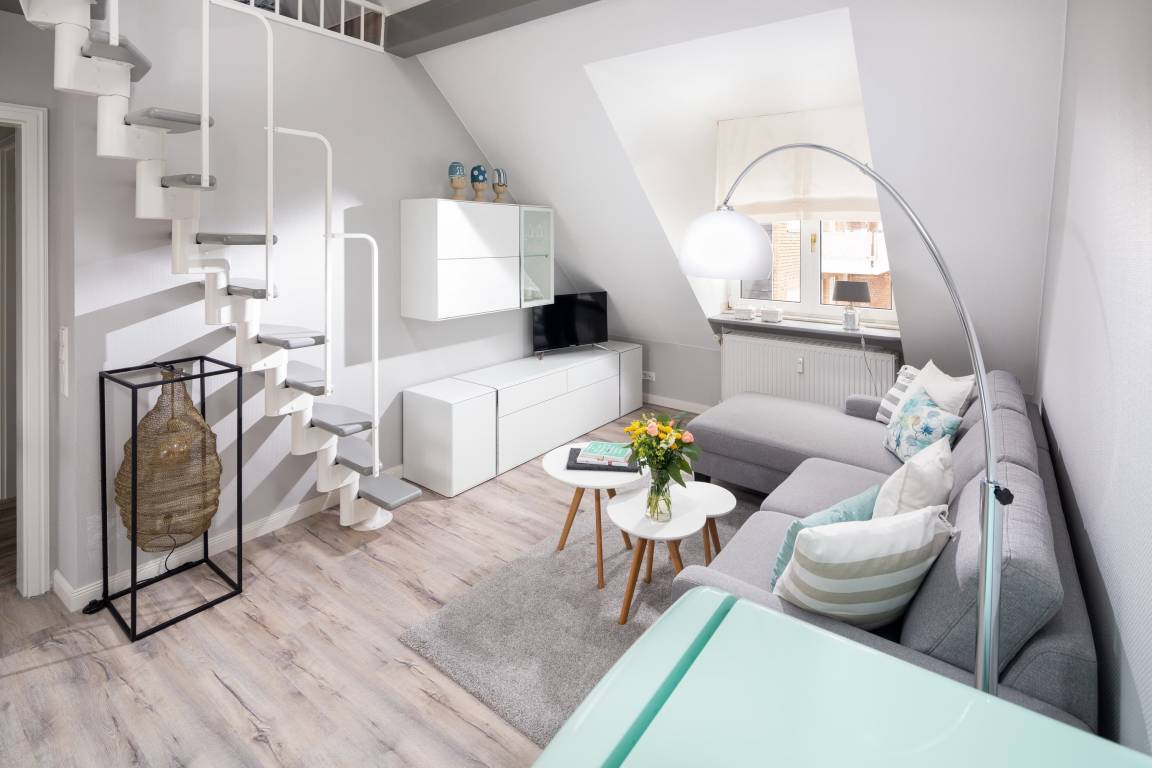 Die gemütliche Wohnung liegt in der Friedrichstraße, nur 50m von der Nordsee und der beliebten Milchbar entfernt und wurde Anfang 2020 saniert. Auf 42qm bietet sie Platz für bis zu 4 Personen. Im Wohnzimmer finden Sie neben der gemütlichen Couch auch einen Esstisch für 4 Personen und eine Küchenzeile. Über eine Platzspartreppe gelangen Sie ausserdem in das Highlight der Wohnung – den gemütlichen Schlaf- oder Spielgiebel. Hier ist neben dem 1,40m breiten Bett Platz zum Entspannen oder Spielen. Das separate Schlafzimmer hat ein Doppelbett und reichlich Stauraum im Kleiderschrank. Auch dort finden Sie einen TV. Das Badezimmer ist weiß gefliest und hat eine Dusche. Perfekter Ausgangspunkt für einen Urlaub zu zweit oder eine kleine Familie. Die Wohnung ist beschränkt für die Nutzung von 3 Erwachsenen oder alternativ 2 Erwachsenen und 2 Kindern.