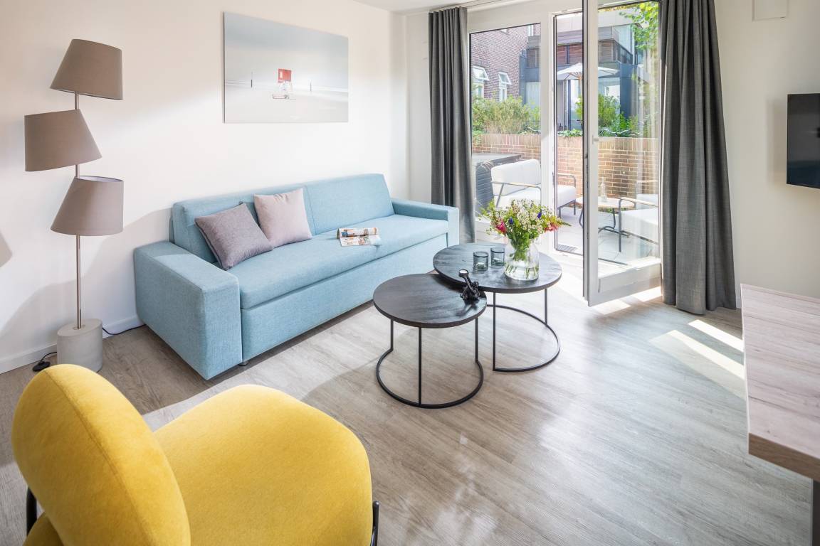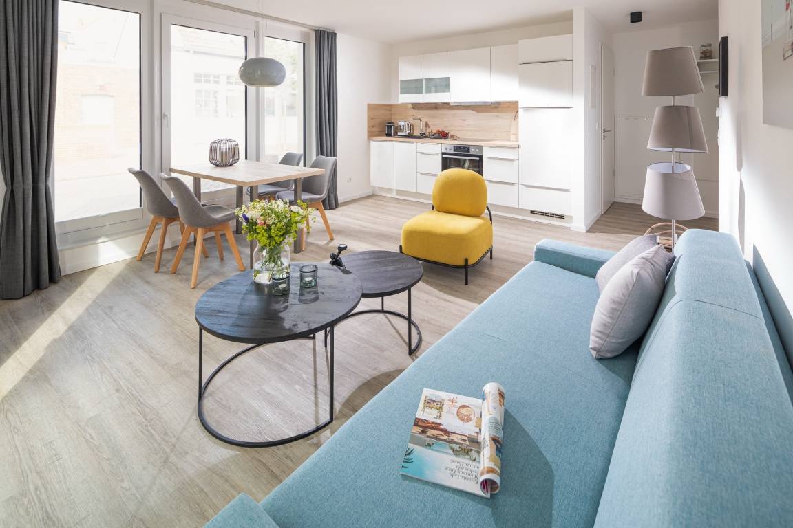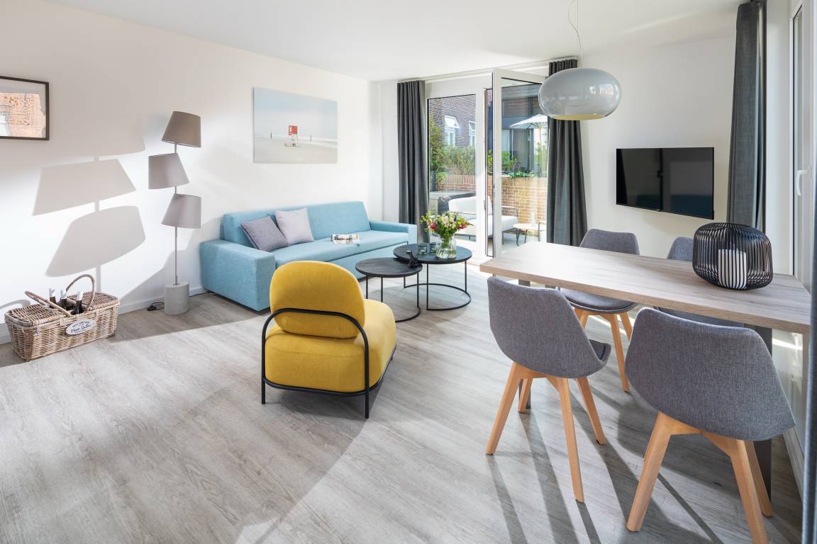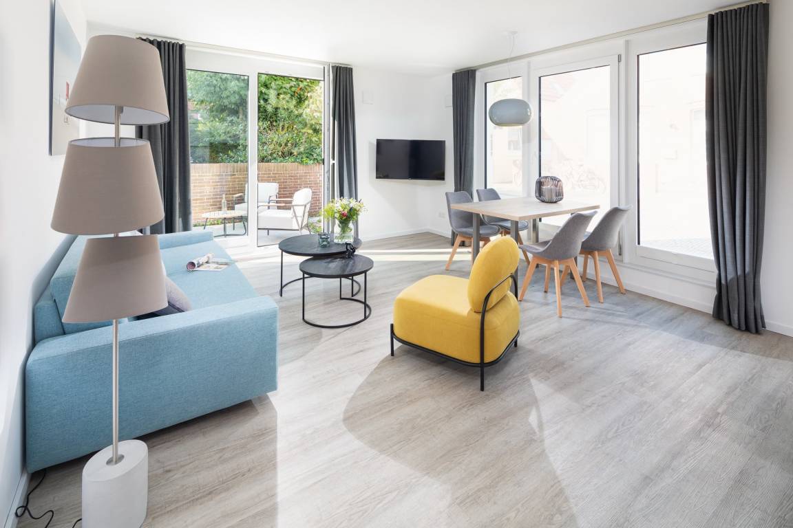 Die Meersuiten sind ein Neubau von 2020, gelegen am Rande der Norderneyer Innenstadt in einer ruhigen Seitenstraße, etwa 400m vom Nordstrand entfernt. Im Haus gibt es insgesamt 7 Wohneinheiten. Die Meersuite N°2 liegt im Erdgeschoss und Souterrain und verfügt im Erdgeschoss über ein Schlafzimmer mit Boxspringbett, ein Badezimmer (ebenerdige Dusche) und einen gemütlichen Wohnraum mit Sofa, Esstisch, offener Küche und Zugang zur Terrasse. Im Souterrain befindet sich das zweite Badezimmer (ebenerdige Dusche) mit Sauna. In dieser Wohnung sind Hunde herzlich willkommen!