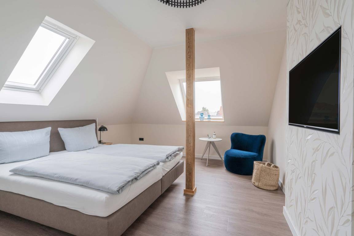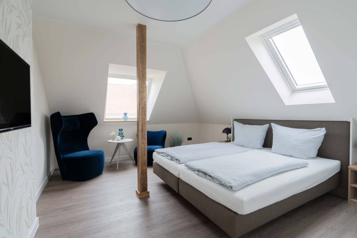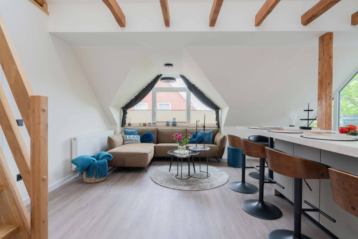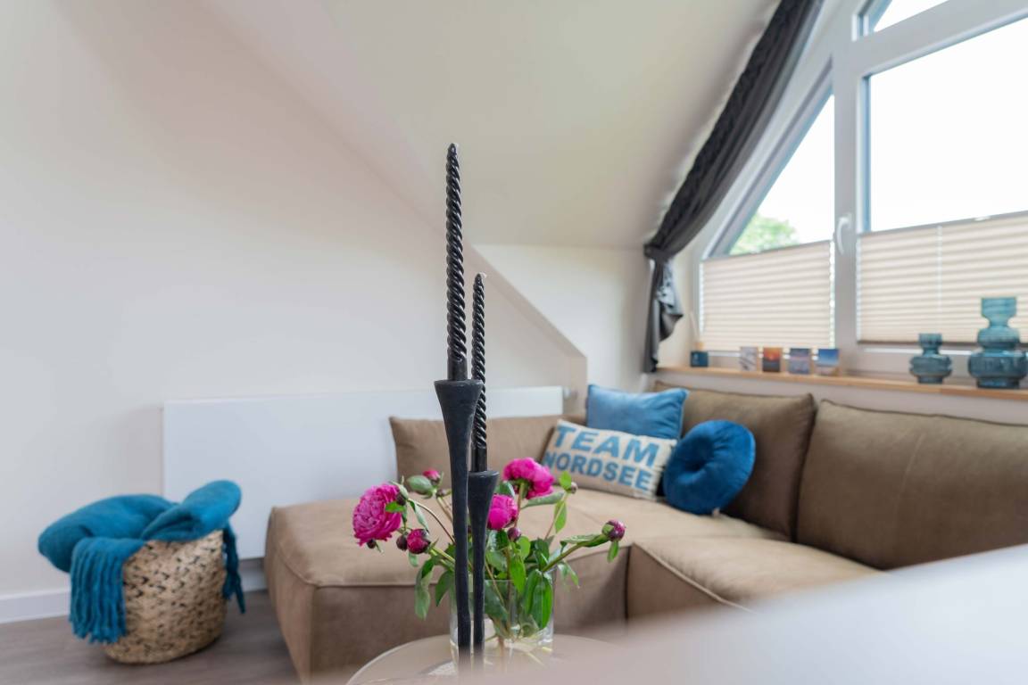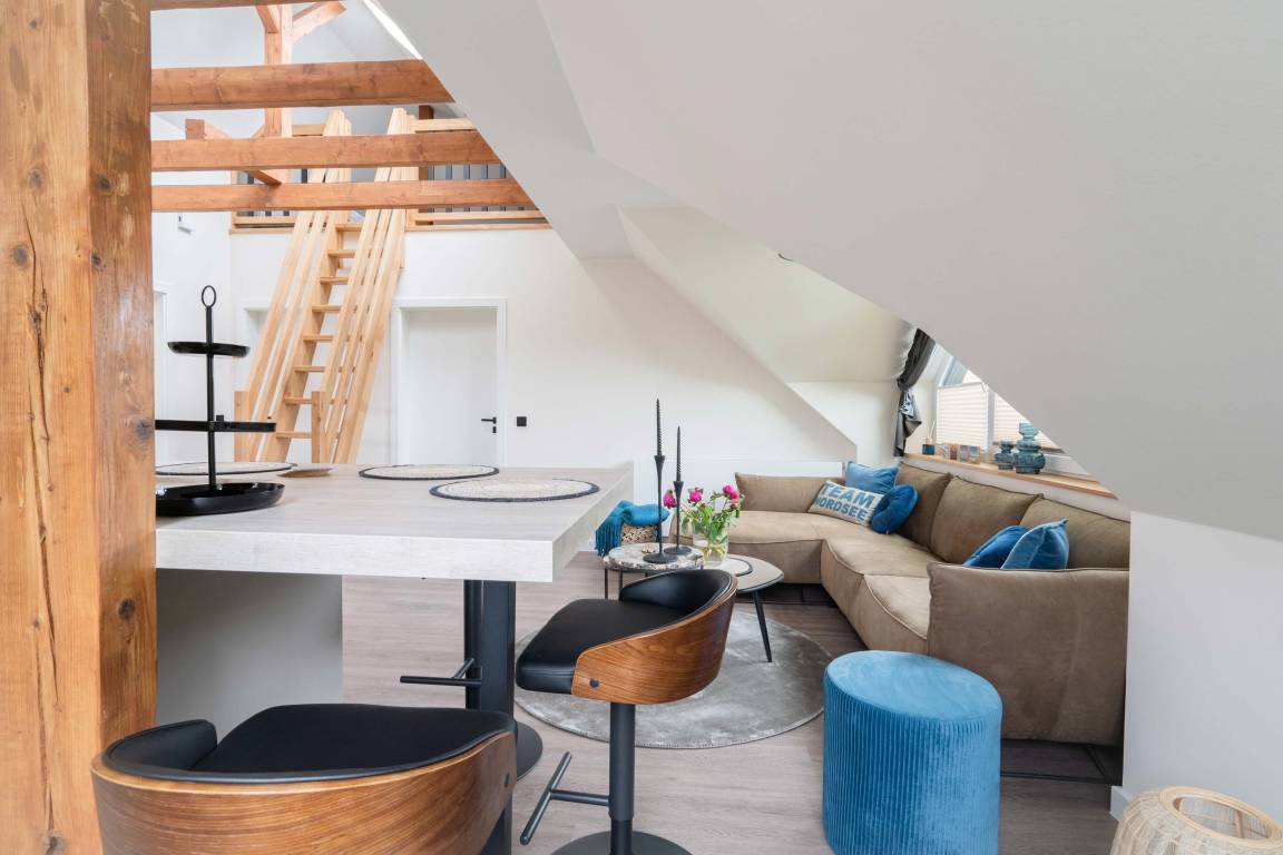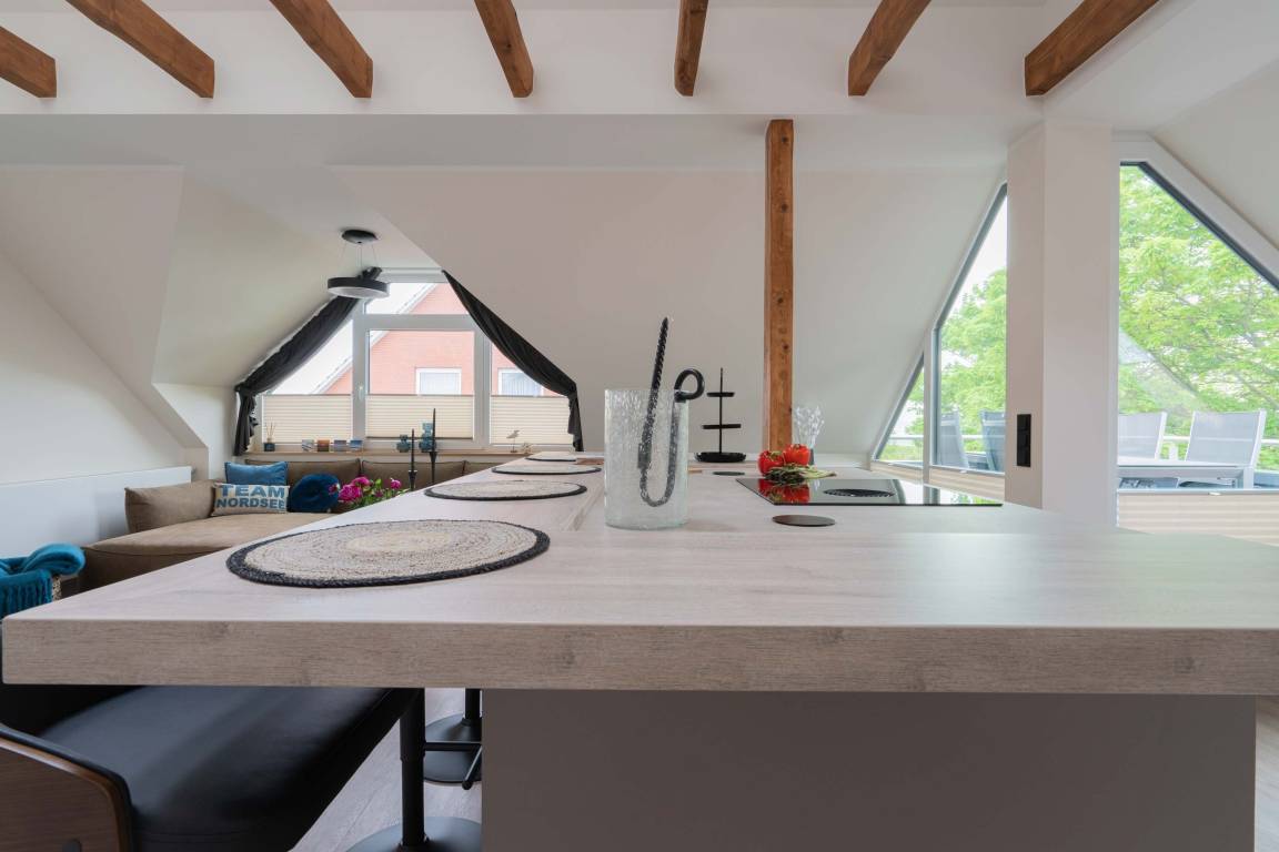 Die 70qm große Ferienwohnung "Neywatt 1" wurde 2022 komplett neugestaltet. Sie liegt ruhig und grün im Fischerhafen, nahe der Surferbucht. Vom Balkon aus haben Sie einen schönen Blick ins Grüne und auf das Wattenmeer. Im Wohnbereich besticht die Wohnung mit ihrer Großzügigkeit und einer sehr geräumigen Wohnküche. An der gut ausgestatteten Kochinsel können köstliche Mahlzeiten zubereitet werden und dort direkt gemeinsam genossen werden. Entspannung danach bietet die liebevoll gestaltete, gemütliche Sofaecke. Die zwei großzügigen Schlafräume sind jeweils mit einem Doppelbett (180cm) und TV ausgestattet. Einen zusätzlichen Schlafplatz für eine weitere Person gibt es im Giebel des Wohnraums. Das Duschbad bietet neben der Regendusche eine eigene Waschmaschine (kostenpflichtig) und einen Trockner (kostenpflichtig). Vor dem Haus steht Ihnen ein PKW-Stellplatz zur Verfügung.