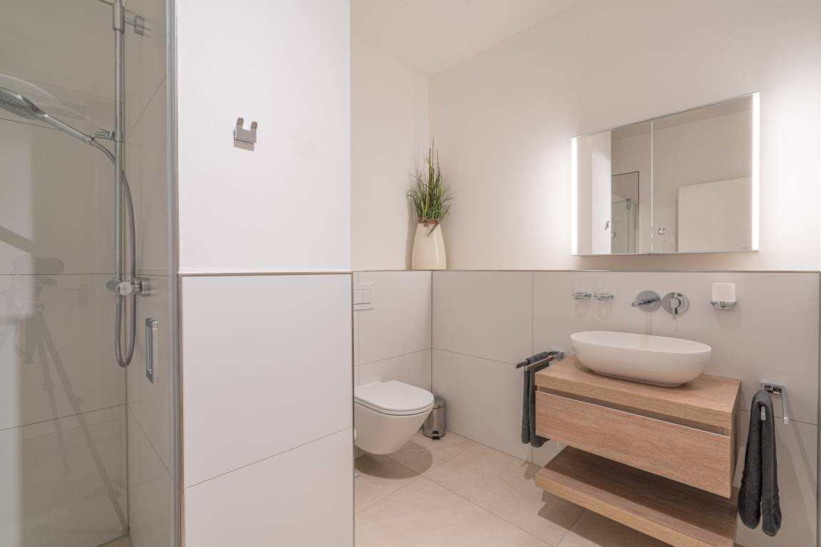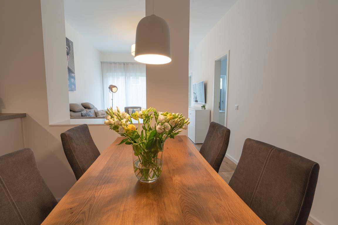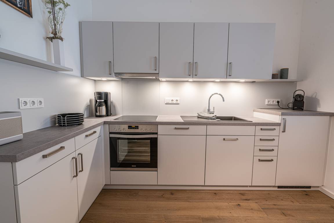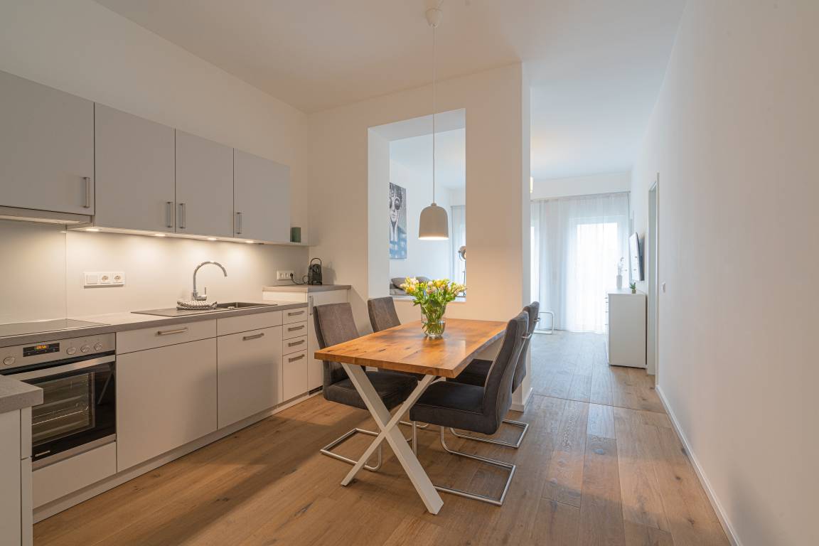 Die moderne Einbauküche mit Induktionskochfeld, Backofen, Spülmaschine und Kühl-/Gefrierkombination bietet die Möglichkeit zu einem Kochvergnügen am Abend. Die Wohnung verfügt über kostenfreies WLAN und eine Fußbodenheizung.