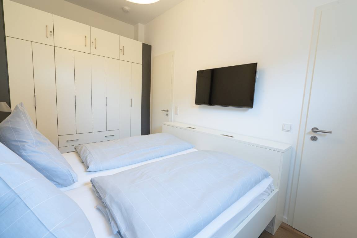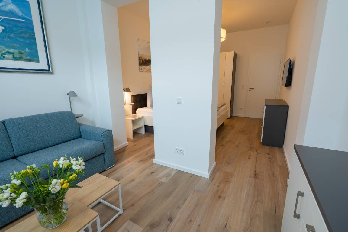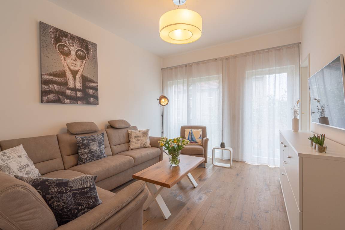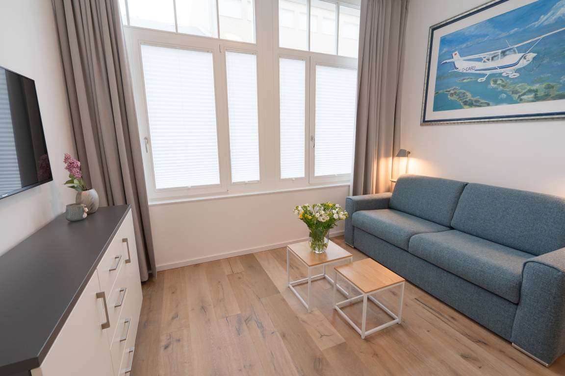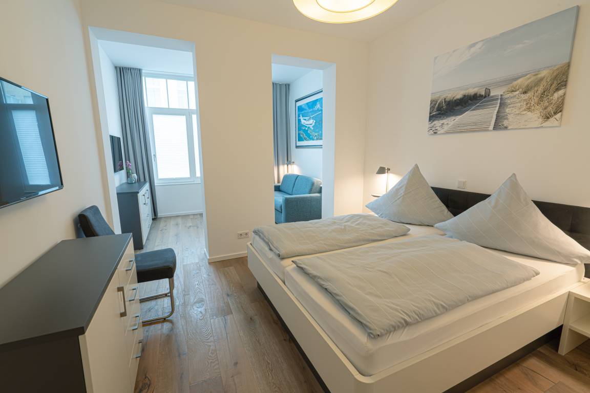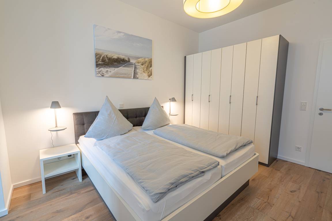 Diese exklusive Wohnung „Meergenuss" ist eine 79 m² große, mit Echtholzparkett ausgelegte Wohnung. Sie befindet sich im Erdgeschoss und überzeugt durch den perfekten Grundriss mit einem großen Wohn- und Esszimmer inkl. Küche mit Wohncharakter, zwei Schlafräumen sowie Bad und Terrasse im ruhigen Hinterhof. Die 3,50 Meter hohen Decken verleihen dem Appartement einen besonderen Charme. Die Wohnung bietet zwei Schlafzimmer mit Doppelbett und TV. Im zweiten Schlafzimmer befindet sich eine abgegrenzte Wohnzimmerecke mit Couch, Sessel und einem weiteren Fernseher. Über die Bang [&] Olufsen Bluetooth-Lautsprecher können Sie Musik nach Ihrem eigenen Geschmack geniessen.