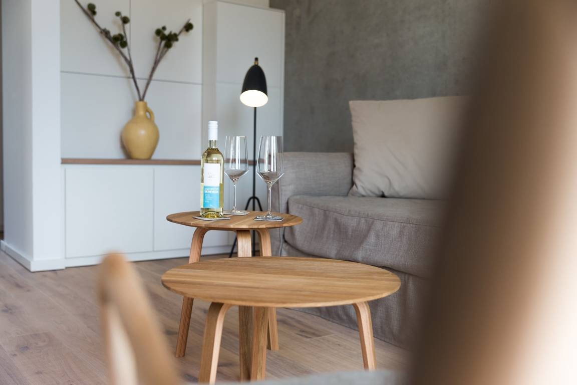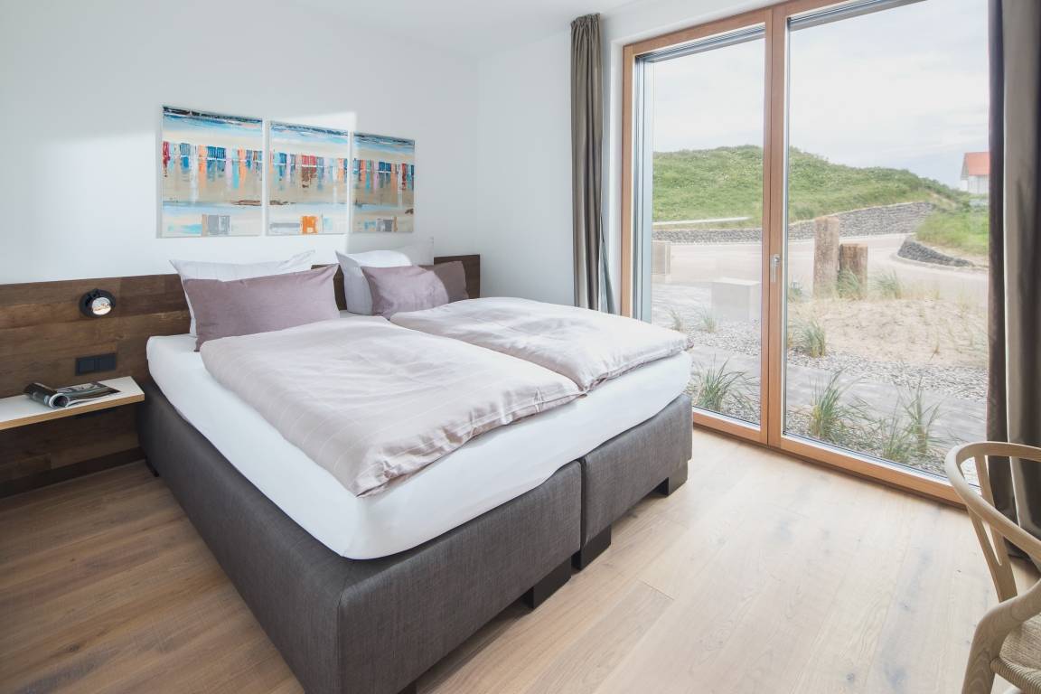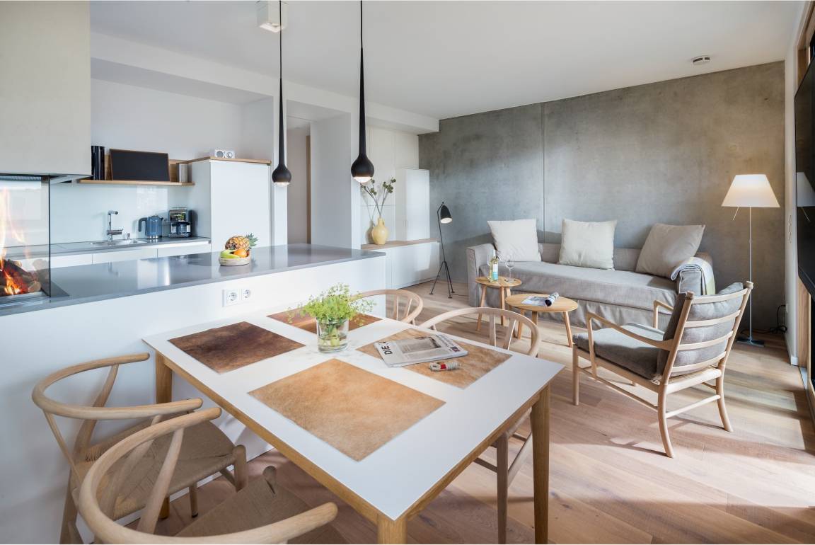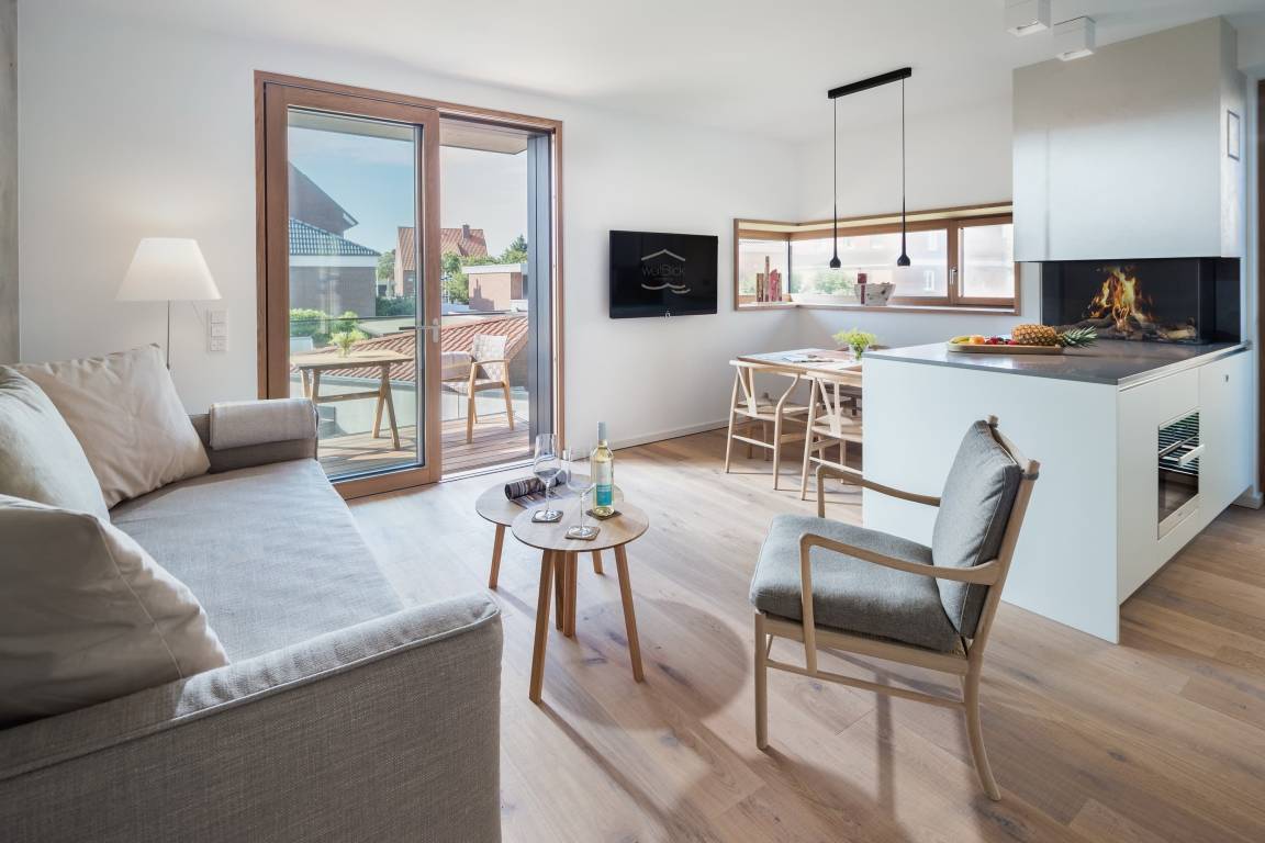 Die Ferienwohnung „dünenBlick" ist eine exklusiv ausgestattete Wohnung mit 55qm für zwei Personen. Ausgestattet mit einem großzügigen Wohn- und Essbereich inkl. Gas-Kamin und gemütlichem Sofa, offener Küche, einem Südbalkon zum Garten, Schlafzimmer mit Doppelbett, Badezimmer und Gäste-WC.