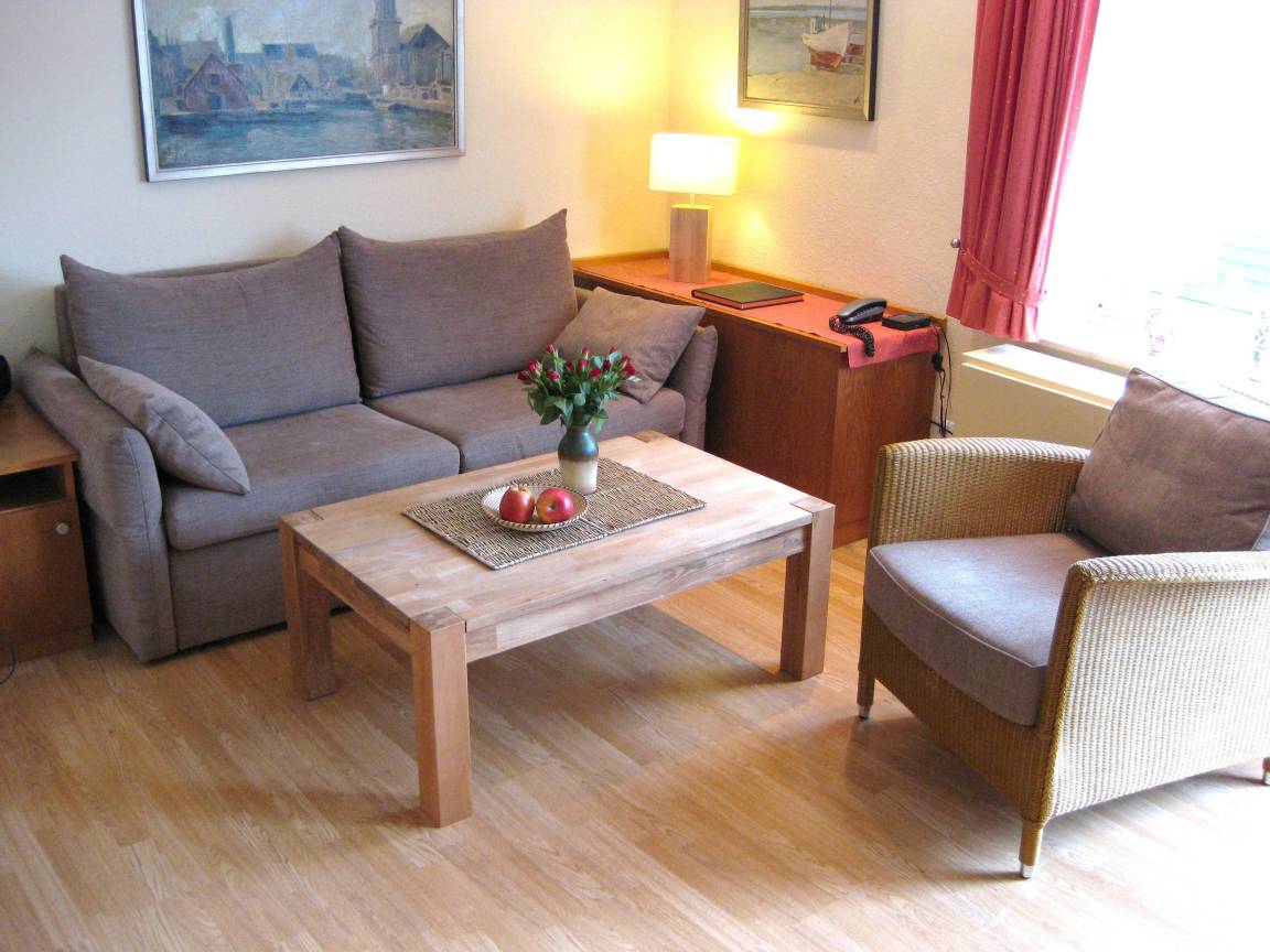 Die gemütlich eingerichtete Ferienwohnung mit Balkon in Süd-West-Ausrichtung ist ca. 40 qm groß und liegt im I. Obergeschoss in zentraler ruhiger Lage im Ortskern von Norderney.