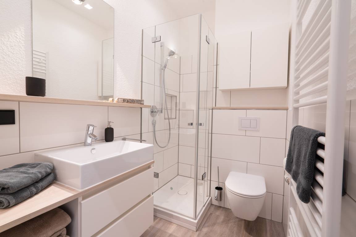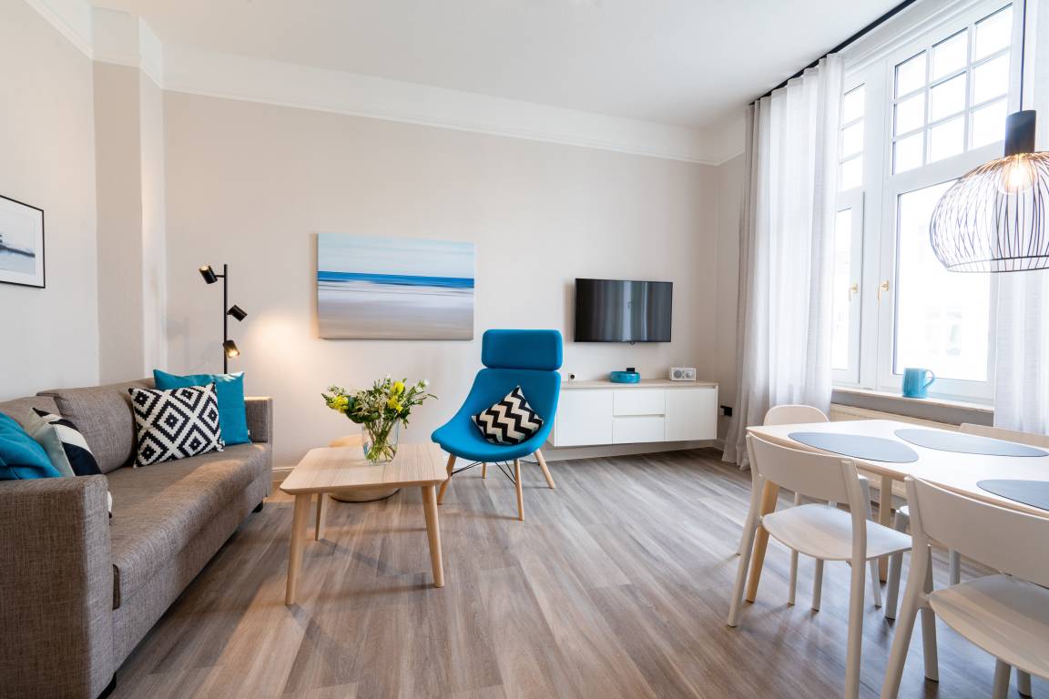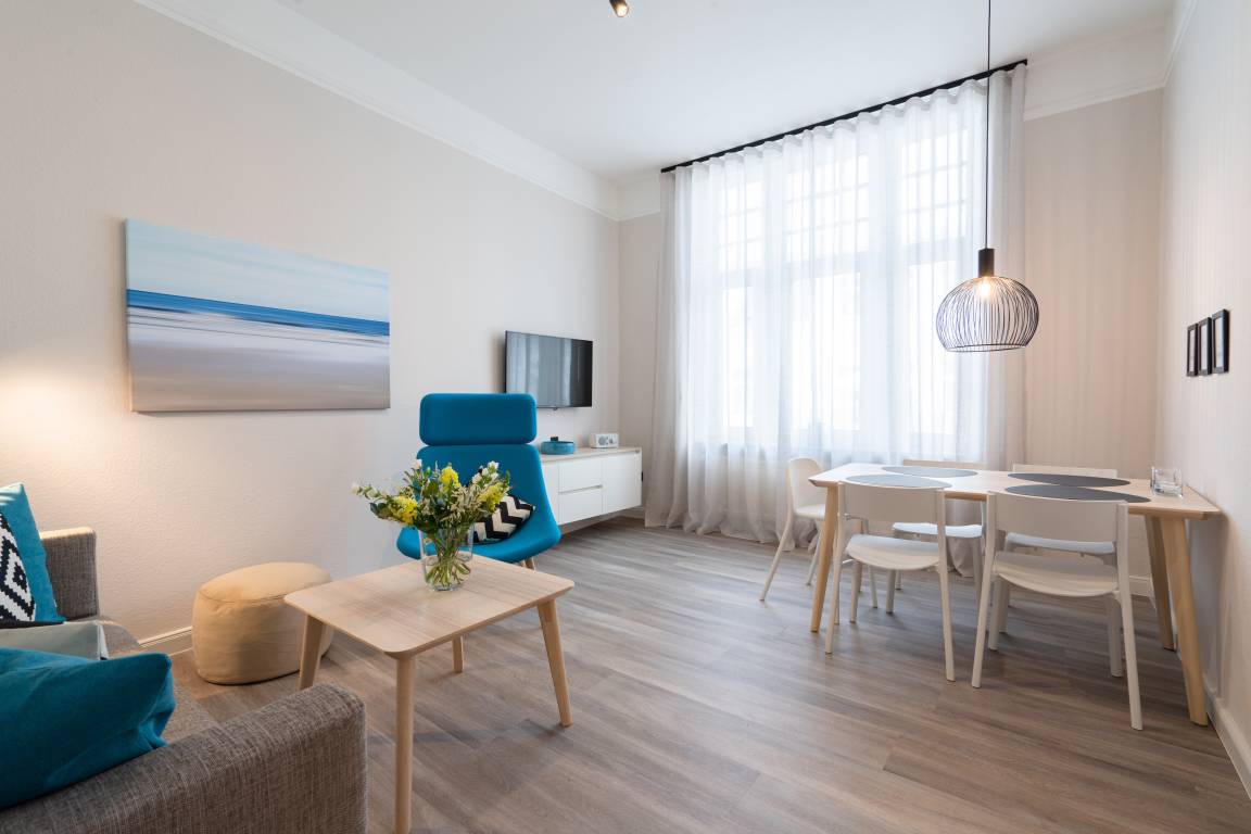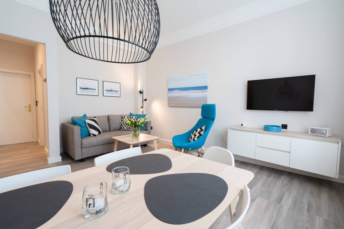 Die „Kleine Perle" liegt in der Friedrichstraße, zentrumsnah und nur 2 Fussminuten vom Strand entfernt. Die 2021 komplett renovierte Wohnung liegt im 01. OG eines wunderschönen Altbaus. Sie bietet ein helles Wohnzimmer mit Esstisch und angrenzender Küchenzeile und eine gemütliche Sofaecke (ausziehbar als alternative Schlafgelegenheit) mit Fernseher. Vom Flur gehen sowohl das Schlafzimmer mit Doppelbett und weiterem TV als auch das moderne Duschbad ab. Der perfekte Ausgangspunkt für eine gemütliche Zeit und einen entspannenden Urlaub auf Norderney für bis zu 3 Personen. Es stehen Waschmaschine [&] Trockner (gegen Gebühr) zur Verfügung.