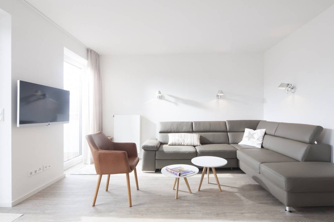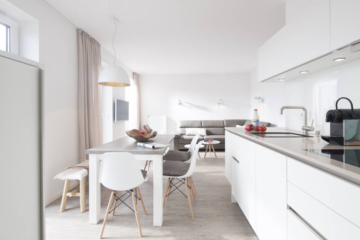 Die Wohnung im 1. Obergeschoss (bequem per Aufzug erreichbar) bietet mit zwei Schlafzimmern Platz für bis zu 4 Personen – ideal für Paare, Freunde oder Familien. Die Einrichtung ist modern, hell und lädt vom ersten Moment an zum Wohlfühlen ein. Mittelpunkt der Wohnung ist der gemütliche Wohnbereich mit offener Küche – perfekt, um gemeinsam zu kochen, zu essen und zu entspannen.