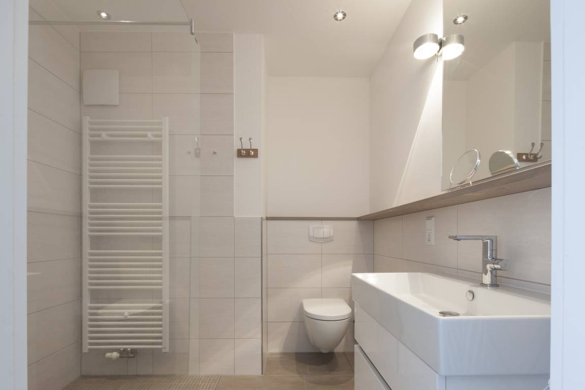 Ein modernes Bad mit großer, ebenerdiger Dusche und WLAN machen den Komfort komplett.