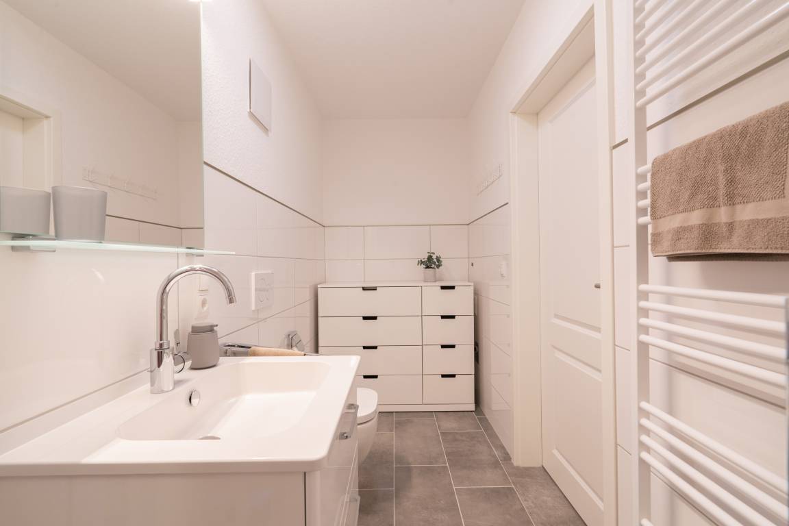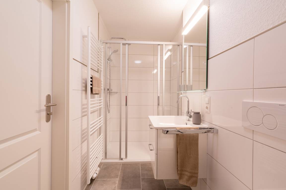 Das Duschbad bietet reichlich Platz für zwei und extra Stauraum.