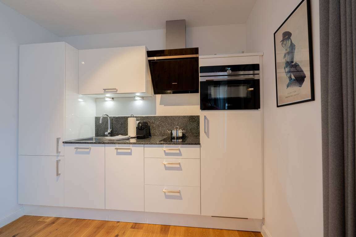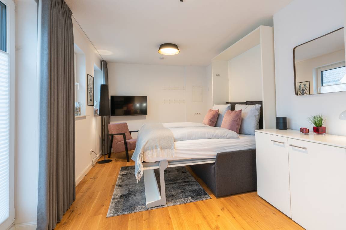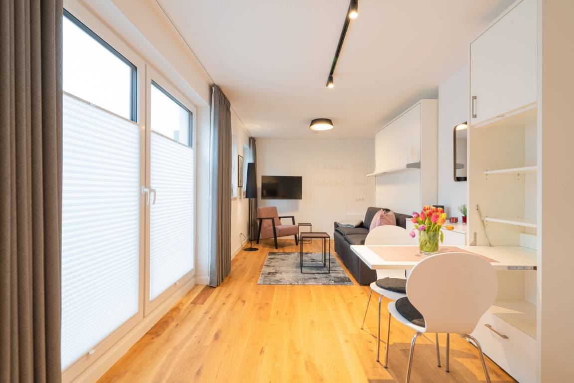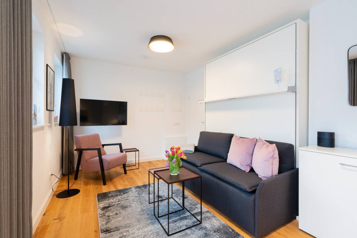 "Lighthouse 4" ist eine helles Einraumappartement mit Echtholzparkett, voll ausgestatteter Einbauküche
