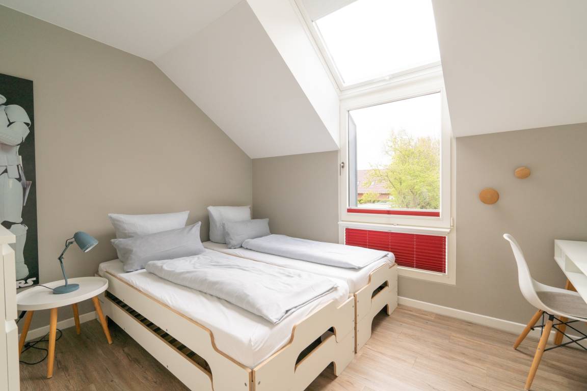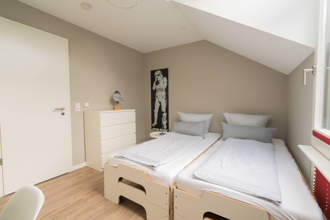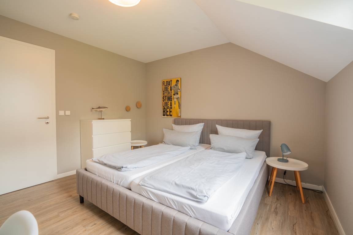 In der ersten Etage befinden sich zwei Schlafzimmer mit Doppelbetten und zwei Badezimmer, eines mit Dusche und WC, eines mit Badewanne und WC. Im Dachgeschoss befindet sich ein weiterer, großer Schlafraum mit Doppelbett.