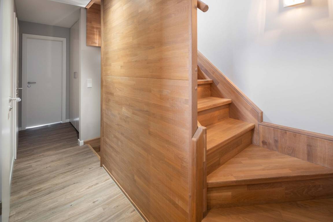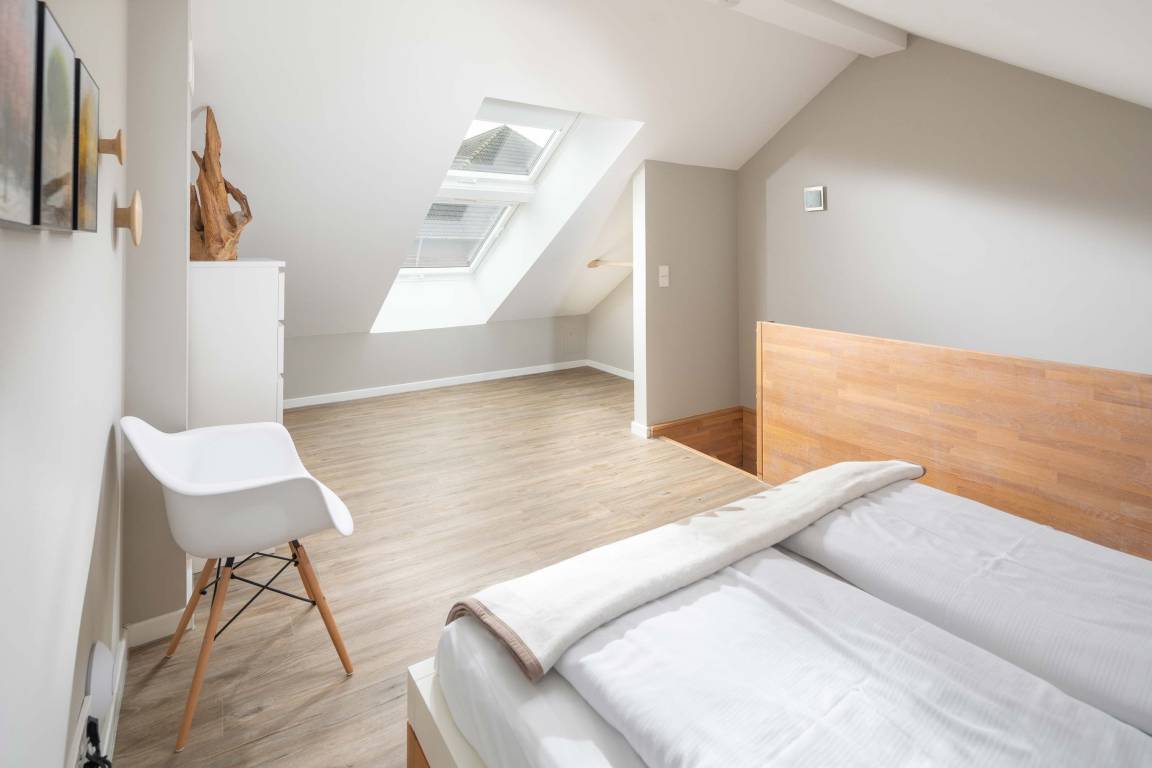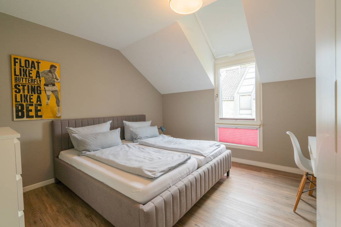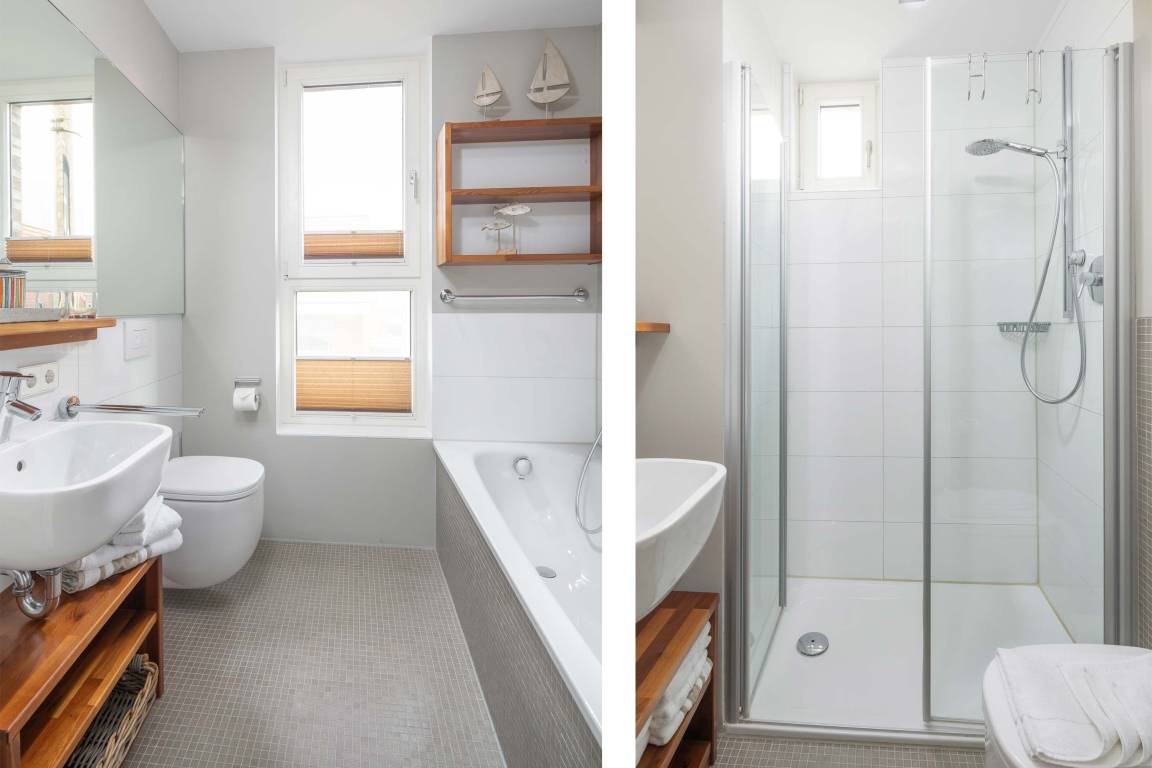 In der ersten Etage befinden sich zwei Schlafzimmer mit Doppelbetten und zwei Badezimmer, eines mit Dusche und WC, eines mit Badewanne und WC. Im Dachgeschoss befindet sich ein weiterer, großer Schlafraum mit Doppelbett.
