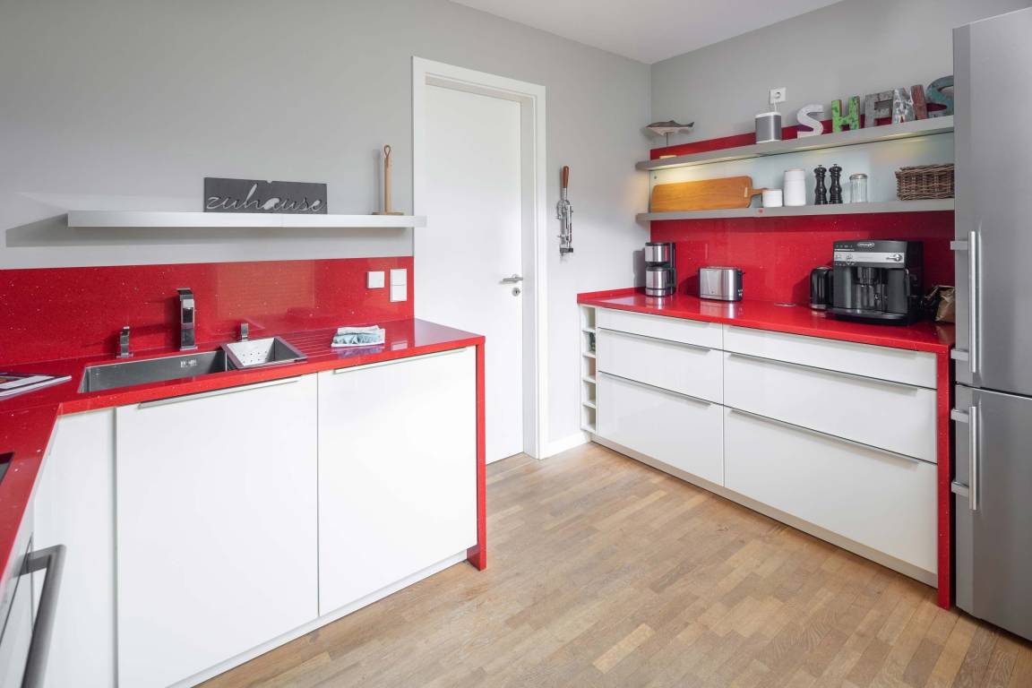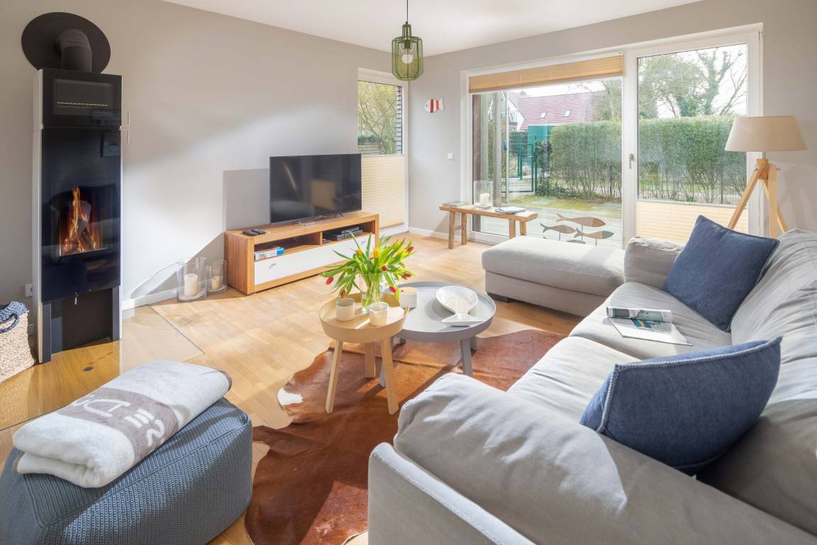 Der Wohnraum bietet eine gemütliche Sitzecke mit Eckcouch und Fernseher. In der kalten Jahreszeit verbreitet der Kamin wohlige Wärme. Ein geräumiger Esstisch mit angrenzender Küche, Gäste-WC und Garderobe befinden sich ebenfalls im unteren Bereich des Hauses. Von hier gelangt man auch auf die Terrasse mit eigenem Gartenteil um entspannt den Urlaubstag ausklingen zu lassen.