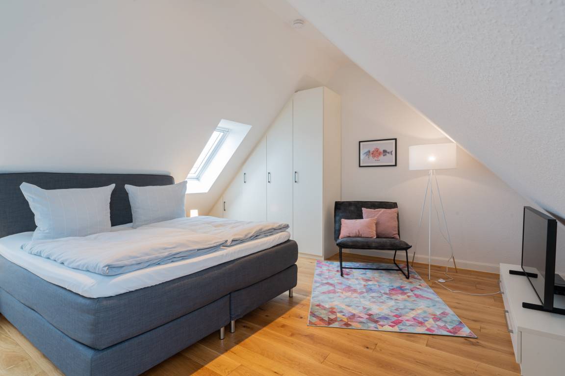Das separate Schlafzimmer im Dachgeschoss mit Boxspringbett (180cm) bietet neben reichlich Stauraum auch einen zweiten TV.
