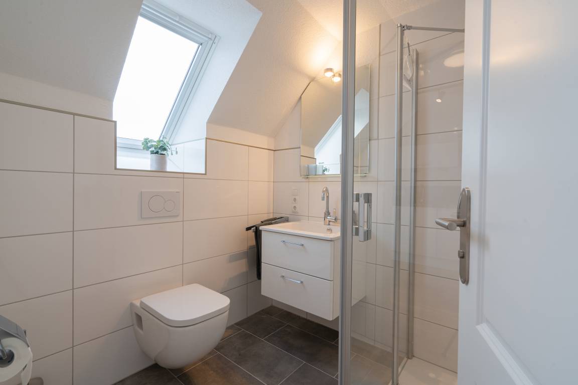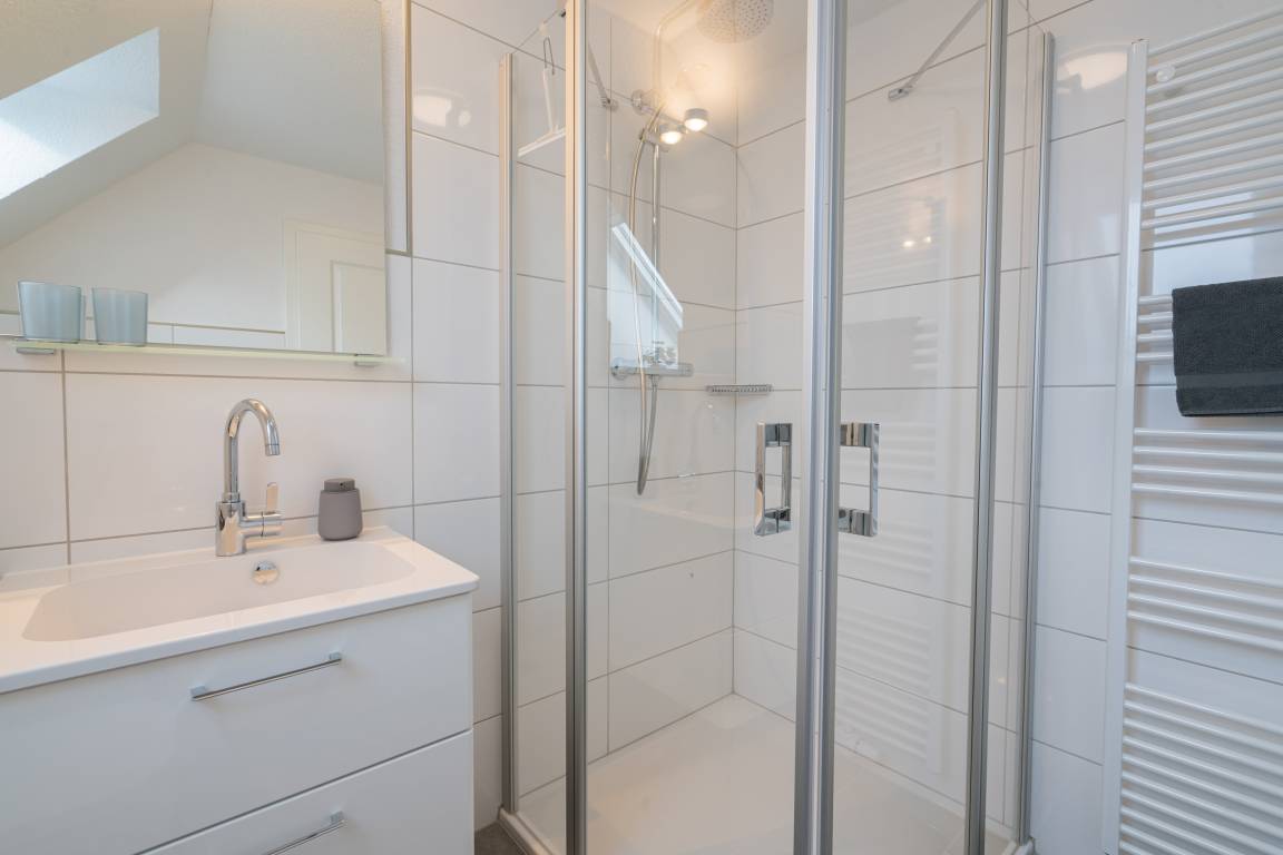 Das Duschbad ist mit einer bodentiefen Duschwanne ausgestattet.