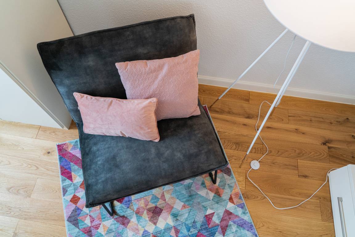 voll ausgestatteter Einbauküche und Balkon. Das gemütliche Sofa (180cm) lässt sich mit wenigen Handgriffen zu einem vollwertigen Bett