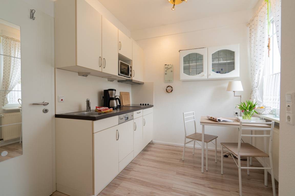 Die vollausgestattete Küche bietet einen Esstisch für zwei Personen, ein 4-Platten-Cerankochfeld, Toaster, Wasserkocher und eine Spülmaschine.