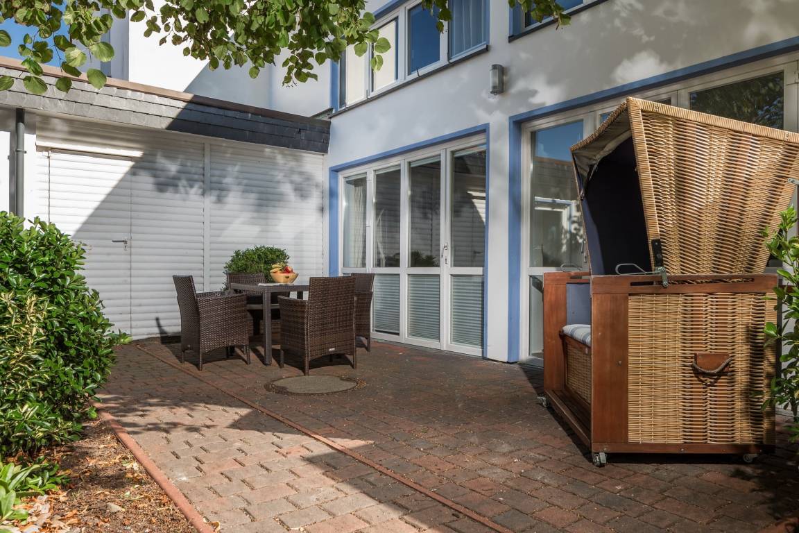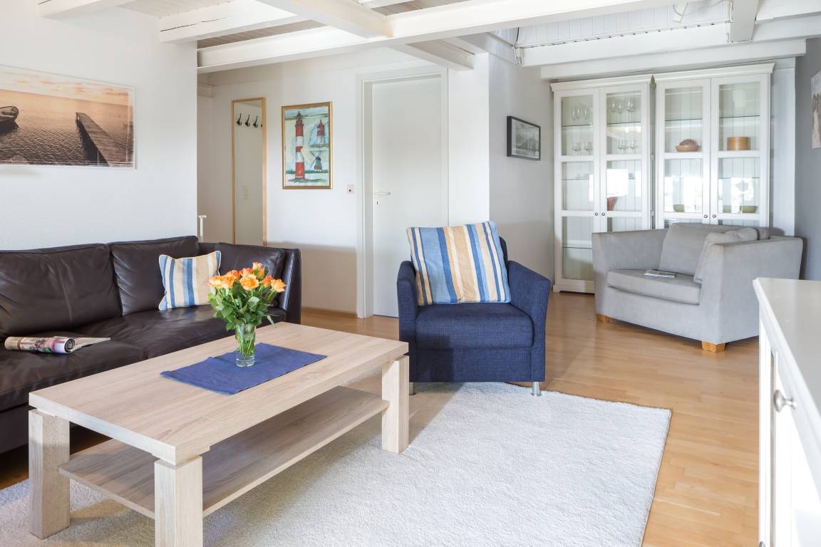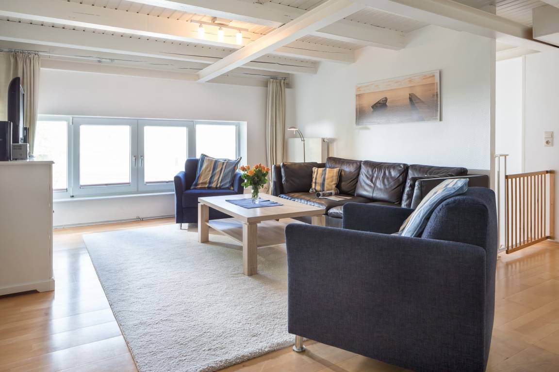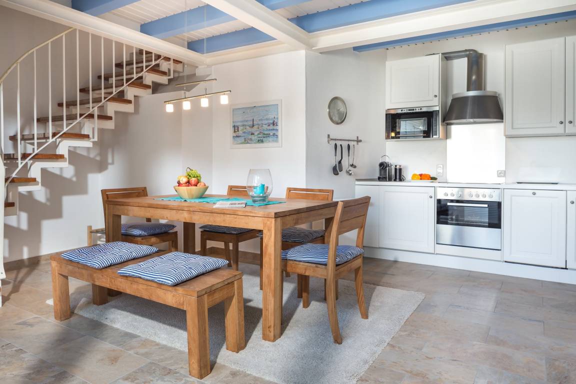 Die Wohnung erreichen Sie über den ruhig gelegenen Innenhof. Im unteren Bereich befindet sich die gemütliche Wohnküche mit geräumigem Esstisch und Zugang zum Hof mit Esstisch und Strandkorb. Über die Treppe von der Wohnküche aus gelangen Sie in den oben gelegenen Wohnbereich mit Sofa, Sesseln und Fernseher – ein Platz zum Entspannen! Von dort gehen beide Schlafzimmer (1x Doppelbett, 1x 2 Einzelbetten) und das Badezimmer ab.