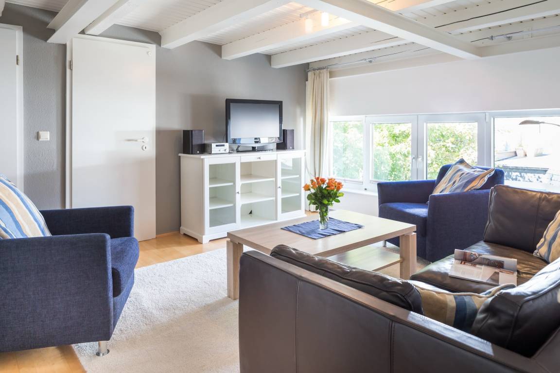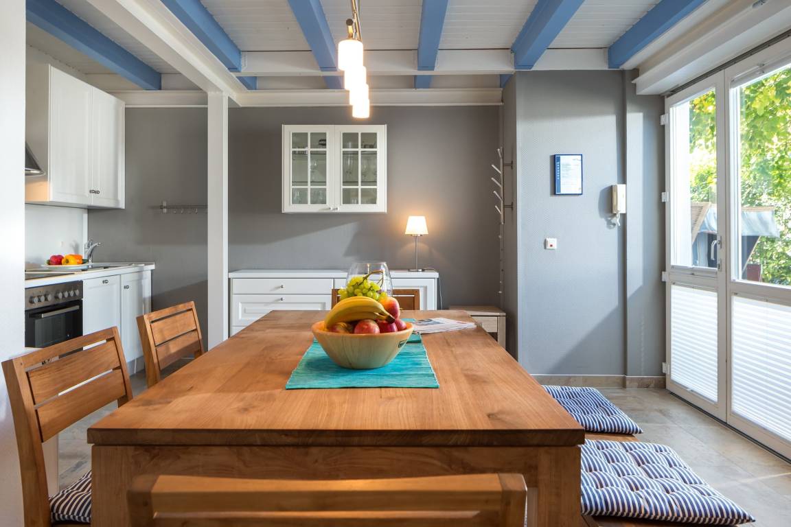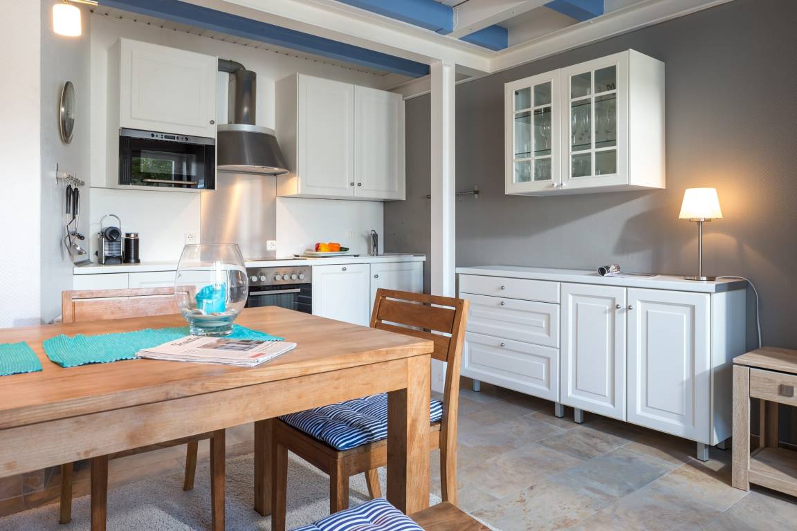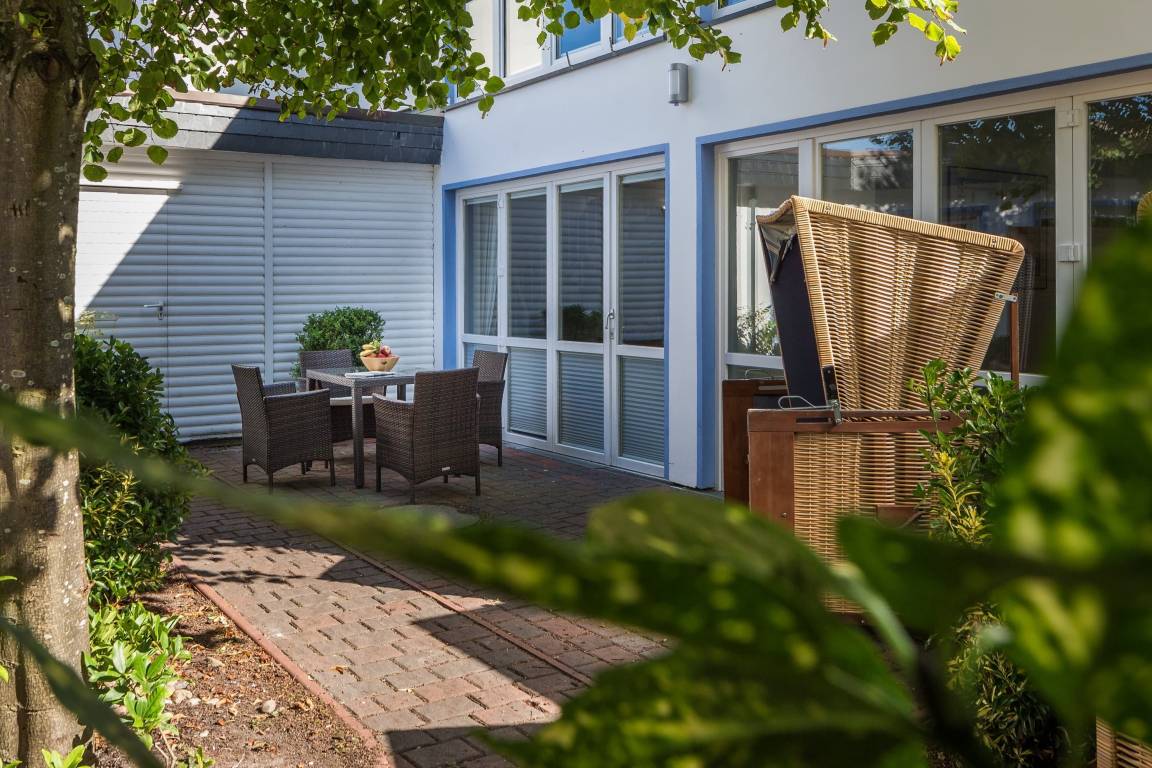 Die Wohnung erreichen Sie über den ruhig gelegenen Innenhof. Im unteren Bereich befindet sich die gemütliche Wohnküche mit geräumigem Esstisch und Zugang zum Hof mit Esstisch und Strandkorb. Über die Treppe von der Wohnküche aus gelangen Sie in den oben gelegenen Wohnbereich mit Sofa, Sesseln und Fernseher – ein Platz zum Entspannen! Von dort gehen beide Schlafzimmer (1x Doppelbett, 1x 2 Einzelbetten) und das Badezimmer ab.