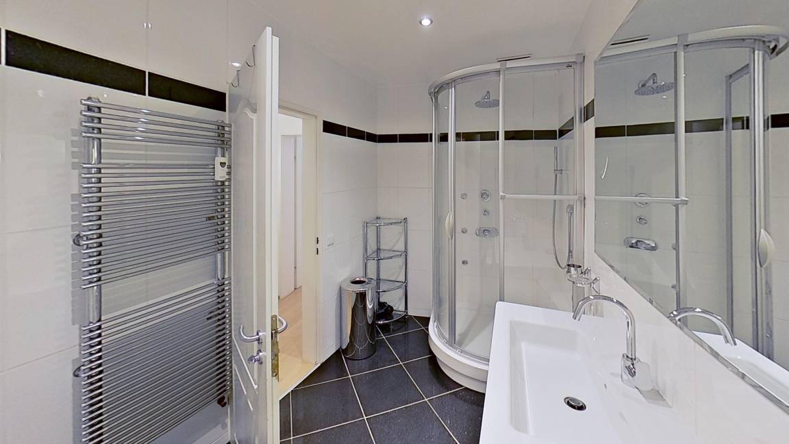 Ein vom Wohnraum abgetrenntes, kleines Schlafzimmer bietet Ihnen ein großes Doppelbett (1,60m x 2,00m). Das Bad bietet eine geräumige Dusche und ein WC mit Bidet. Der Flur ist mit einer Garderobe ausgestattet. Ein Abstellraum für Koffer ist ebenfalls vorhanden.