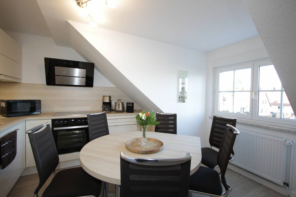 Die wunderschöne, komplett neu ausgestattete Küche bietet Ihnen einen direkten Blick ins Grüne. Die Küche verfügt über eine gehobene Komplettausstattung (Backofen, Induktions-Kochfeld, Kühlschrank- und Gefrierkombination, Geschirrspüler, Mikrowelle, Kaffeemaschine, Wasserkocher, Toaster, Internetradio) und einen Esstisch für max. 7 Personen.