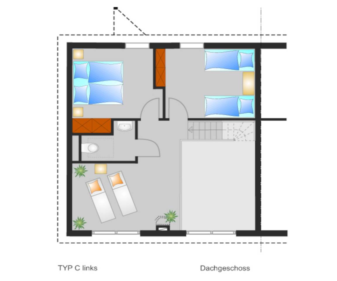 Über eine offene Treppe kommen Sie zur Galerie, die mit 2 Relax-Liegen zum Entspannen, ausgestattet ist. Von dort können Sie einen schönen Ausblick genießen. In einem gemütlich eingerichteten Schlafzimmer finden Sie dann ihre wohlverdiente Ruhe. Ein zweites Schlafzimmer befindet sich direkt nebenan und ein weiteres WC auf dieser Etage erhöht den Komfort.