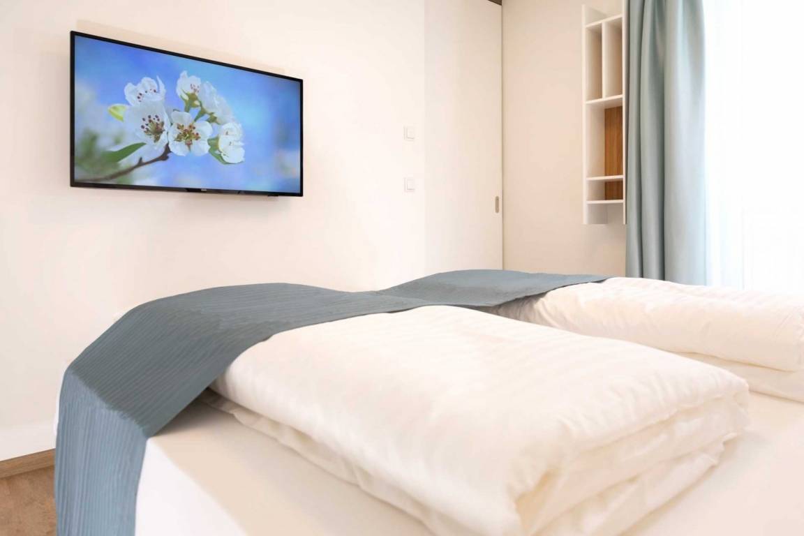 Der Tisch im Essbereich mit 2 Stühlen ist multifunktional und kann durch seine technische Ausstattung auch als Schreibtisch genutzt werden. Ganz selbstverständlich verfügt das Apartment über einen kostenfreien Internetanschluss, einen internetfähigen Smart-TV und ein Bluetooth-Radio.