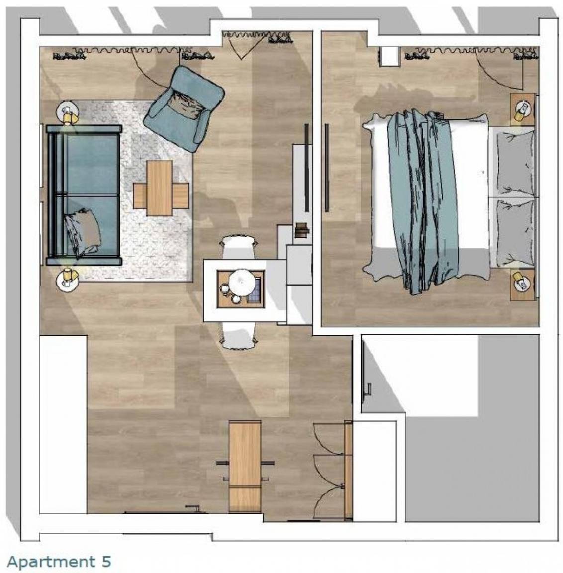 Die Garderobe im Eingangsbereich und der Kleiderschrank, sowie der wohnliche Sitzbereich mit gemütlichem Schlafsofa und Sessel runden die Einrichtung ab.
